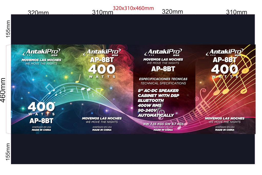 ANTAKIPRO AP-8BT 8-inch AC-DC Powered DJ PA Speaker Bluetooth System Cabinet with Digital Signal Processor 400 Watts Rms 90-240 Volts AutomaticTechnical Specifications || * 8-inch || * AC-DC Speaker || * Cabinet with DSP || * Bluetooth || * 400 Watts Rms || * 90 - 240 Vots || * Automatically ||Physical Specifications || * Item Dimension : (L) 270mm x (W) 280mm x (H) 400mm | (L) 10.63 in. x (W) 11.02 in. x (H) 15.75 in. || * Shipping Dimension : (L) 320mm x (W) 310mm x (H) 460mm | (L) 12.60 in. x (W) 12.20 in. x (H) 18.11 in. || * Net Weight : 7.35 Kgs | 16.20 lbs. || * Gross Weight : 9.7 Kgs | 21.38 lbs. ||The Antakipro AP-8BT appears to be a powered PA speaker designed for events, clubs, and parties. ||It likely features Bluetooth streaming capabilities, a robust woofer, and various input options for connectivity ||It sounds like you're looking for a speaker cabinet with a Digital Signal Processor (DSP). DSPs are great for optimizing sound quality and providing various audio enhancements.