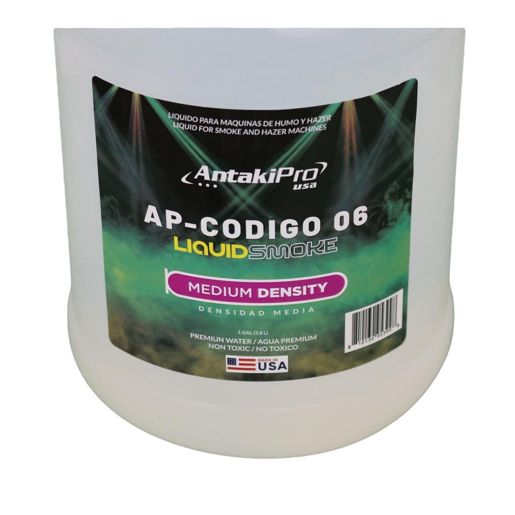 ANTAKIPRO AP-CODIGO6 Medium Density Fog Juice Liquidsmoke Non-Toxic Odorless Water-Based Fog Machine Fluid for All Standard Fog Machines - 1 GallonPremium water-based fog machine fluid - safe and non-toxic - does not contain dipropylene glycol or other potentially hazardous chemicals. enjoy a clean, dry, odorless fog! ||Meduim density fog is perfect for a lighting enhancement that doesn't obscure other visual elements of your environment. ||Tested & rigorously formulated to produce a longer-lasting fog than competitors. Be confident in an excellent hang time and well-dispersed fog. ||Perfect for setting the environment for any number of events or entertaining, including live music, DJ's, parties, clubs, theatrical presentations, church, or haunted houses! ||Suitable for any standard fog machine. Optimized for use in 500W fogger.