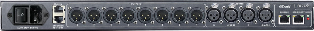 AUDIO (2) || Number of Dante channels : 4x4@48kHz 2x2@96kHz Ultimo/Brooklyn optional || Common Mode Rejection Ratio : 65dB || Number of analog input channels : 4 || Number of analog output channels : 8 || Rs485 control port : 2 || Network control port : 1 || GENERAL || Dimensions : 482x44x253(mm) 1RU || Package size : 580x340x120(mm) || Weight, Net / Shipping : 3.3 Kg / 3.8Kg || Preset number : 50 ||