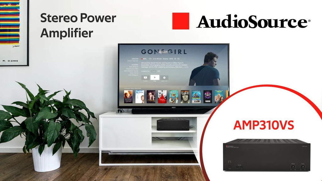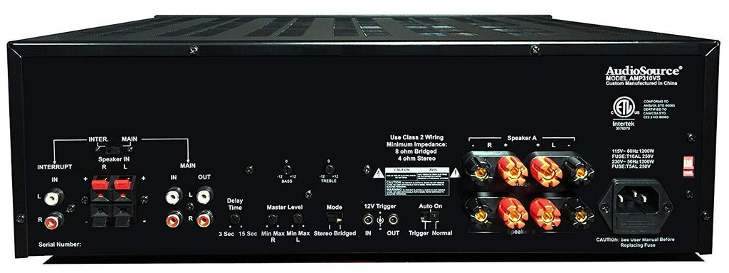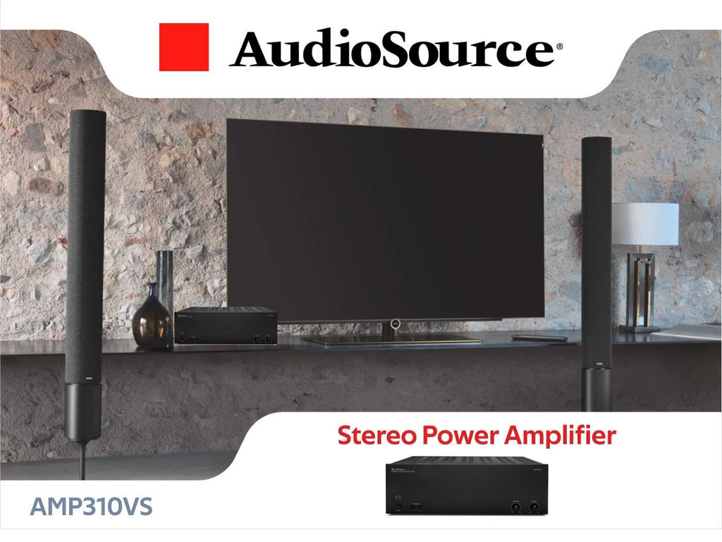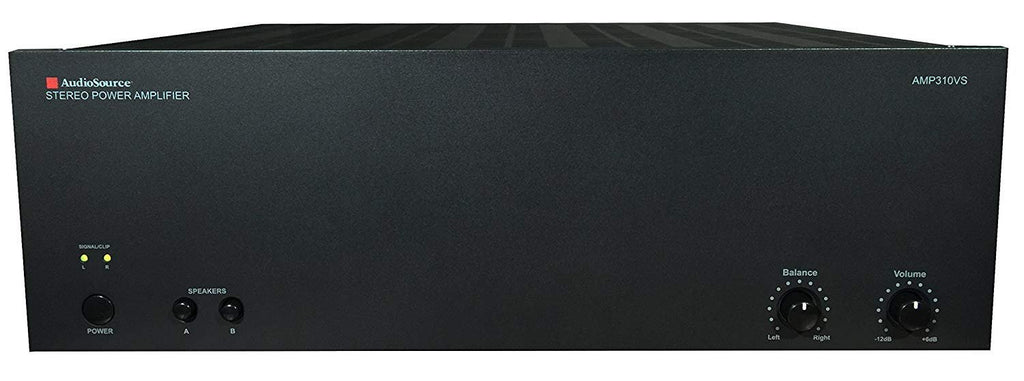 AudioSource Analog Amplifier, Stereo More Power A Amplifier AMP310VS for Home Sound SystemsPOWER YOUR SOUND SYSTEM: 2 Channels rated at 150 watts into 8 ohms. 225 watts RMS per channel at 4 ohms. Bridge Output: 450 Watts at 8 ohms.HIGHLIGHTS: 5-Way Binding Posts. A/B Speaker selector. Auto Signal Sensing Power On. Dual Auto-Switching Inputs. Dual-differential error amplifiers. Front panel balance and volume controls. Front panel diagnostic LEDS. High level inputs. Line 2 Auxiliary output. Rear independent left/right master level controls. Rear mounted treble and bass controls. Triple-Darlington Power Amplifier Stages. Rack mountable (Rack ears included).AUTOMATICALLY KNOWS WHEN TO TURN ON: This amplifier is audio sensing, meaning it automatically turns on when you start your system.PERFECT FOR ANY HOME AUDIO SYSTEM: Our stereo amplifiers are great for home theaters and outdoor systems. Enjoy professional quality audio in the comfort of your own home.SPECIALLY DESIGNED FOR MULTIPLE ROOMS: Our amplifiers allow you to deliver high quality sound and power to multiple rooms for the ultimate surround sound experience.