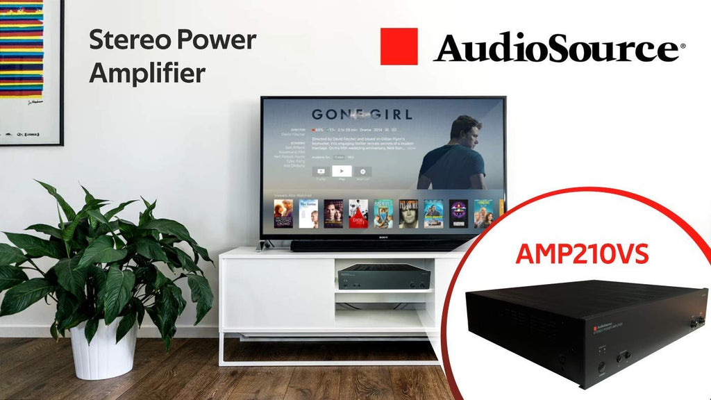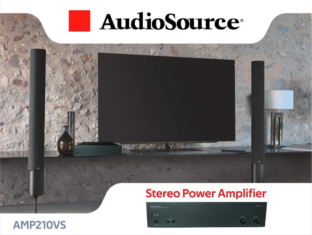 AudioSource Analog Amplifier, Stereo Power A Amplifier AMP210VS for Home Sound SystemsPOWER YOUR SOUND SYSTEM: 2 Channels rated at 100 watts into 8 ohms. 125 watts RMS per channel at 4 ohms. Bridge Output: 250 Watts at 8 ohms.HIGHLIGHTS: 5-Way Binding Posts.A/B Speaker selector. Auto Signal Sensing Power On. Dual Auto-Switching Inputs.Dual-differential error amplifiers. Front panel balance and volumen controls. Front panel diagnostic LEDS. High level inputs. Line 2 Auxiliary output. Rear independent left/right master level controls. Rear mounted treble and bass controls. Triple-Darlington Power Amplifier Stages. Rack mountable (Rack ears included).AUTOMATICALLY KNOWS WHEN TO TURN ON: This amplifier is audio sensing, meaning it automatically turns on when you start your system.PERFECT FOR ANY HOME AUDIO SYSTEM: Our stereo amplifiers are great for home theaters and outdoor systems. Enjoy professional quality audio in the comfort of your own home.SPECIALLY DESIGNED FOR MULTIPLE ROOMS: Our amplifiers allow you to deliver high quality sound and power to multiple rooms for the ultimate surround sound experience.