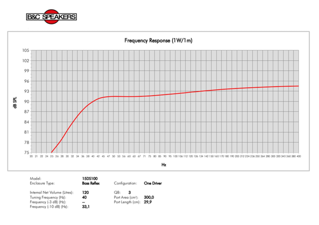 - GENERAL SPECIFICATIONS : Nominal Diameter : 380 mm (15.0 in) | Nominal Impedance : 4 Ω | Minimum Impedance : 3.4 Ω | Nominal Power Handling1 : 1500 W | Continuous power handling2 : 3000 W | Sensitivity (1W/1m)3 : 96.8 dB | Frequency Range : 39 - 1000 Hz | Voice Coil Diameter : 100 mm (4.0 in) | Winding Material : Aluminium | Former Material : Glass Fibre | Winding Depth : 34.0 mm (1.34 in) | Magnetic Gap Depth : 16.0 mm (0.63 in) | Flux Density : 0.7 T | "