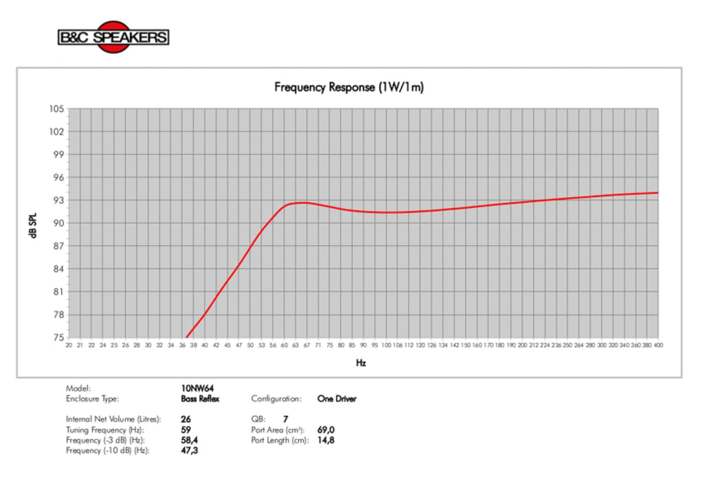 B&C Speakers 10NW64-8 10-inch Woofer Studio Subwoofer Pro Audio Component Speaker Driver for Motorcycle Car 300 Watts Rms 600 Watts Max 8 Ohms Impedance Neodymium Inside Slug"600 W continuous program power capacity || 64 mm (2.5 in) copper voice coil || 60 - 2500 Hz response || 96 dB sensitivity || Neodymium magnet allows a very light yet powerful motor assembly || Shorting copper cap for extended HF response || Ventilated voice coil gap for reduced power compression || Available also in 1.4” and 2” exit version ||""SPECIFICATIONS || Nominal Diameter : 250 mm (10.0 in) || Nominal Impedance : 8 Ω || Minimum Impedance : 6.5 Ω || Nominal Power Handling1 : 300 W || Continuous power handling2 : 600 W || Sensitivity (1W/1m)3 : 96.0 dB || Frequency Range : 60 - 2500 Hz || Voice Coil Diameter : 64 mm (2.5 in) || Winding Material : Copper || Former Material : Glass Fibre || Winding Depth : 16.0 mm (0.62 in) || Magnetic Gap Depth : 8.0 mm (0.31 in) || Flux Density : 1.25 T ||""DESIGN || Surround Shape : Double Roll || Cone Shape : Exponential || Magnet Material : Neodymium Inside Slug || Spider : Single || Pole Design : Straight Pole || Woofer Cone Treatment : TWP Waterproof Both Sides || Recommended Enclosure : 26.0 dm3 (0.92 ft3) || Recommended Tuning : 59 Hz || ""MOUNTING AND SHIPPING INFO || Overall Diameter : Double Roll || Bolt Circle Diameter : Exponential || Baffle Cutout Diameter : Neodymium Inside Slug || Depth : Single || Flange and Gasket Thickness : Straight Pole || Air Volume Occupied by Driver : TWP Waterproof Both Sides || Net Weight : 26.0 dm3 (0.92 ft3) || Shipping Units : 59 Hz || Shipping Weight : Copper || Shipping Box : Glass Fibre || "B&C Speakers has been one of largest and most prestigious professional loudspeaker transducer manufacturers in the world. In addition to designing and distributing components under the B&C brand name, they also supply OEM components to many of the top professional audio brands in the market today.