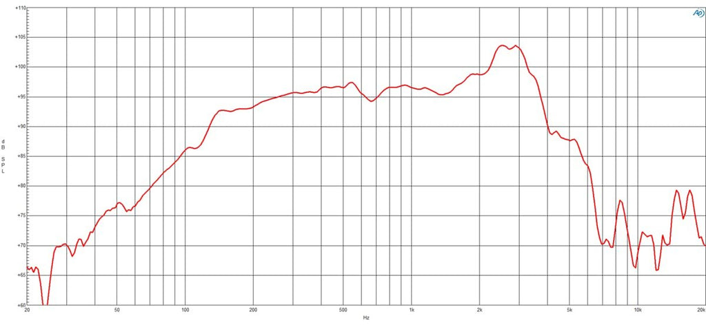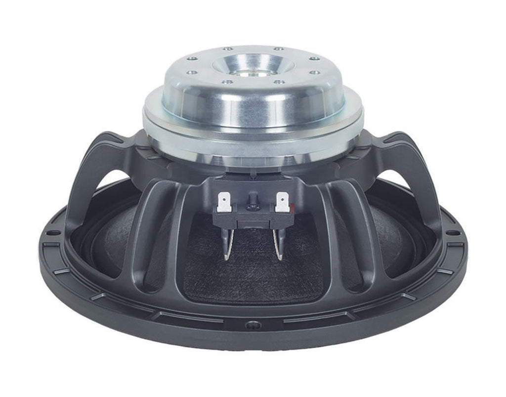 "SPECIFICATIONS || Nominal Diameter : 250 mm (10.0 in) || Nominal Impedance : 8 Ω || Minimum Impedance : 6.6 Ω || Nominal Power Handling1 : 400 W || Continuous power handling2 : 800 W || Sensitivity (1W/1m)3 : 96.5 dB || Frequency Range : 65 - 3500 Hz || Voice Coil Diameter : 76 mm (3.0 in) || Winding Material : CCAW || Former Material : Glass Fibre || Winding Depth : 18.5 mm (0.73 in) || Magnetic Gap Depth : 10.0 mm (0.39 in) || Flux Density : 1.35 T || "