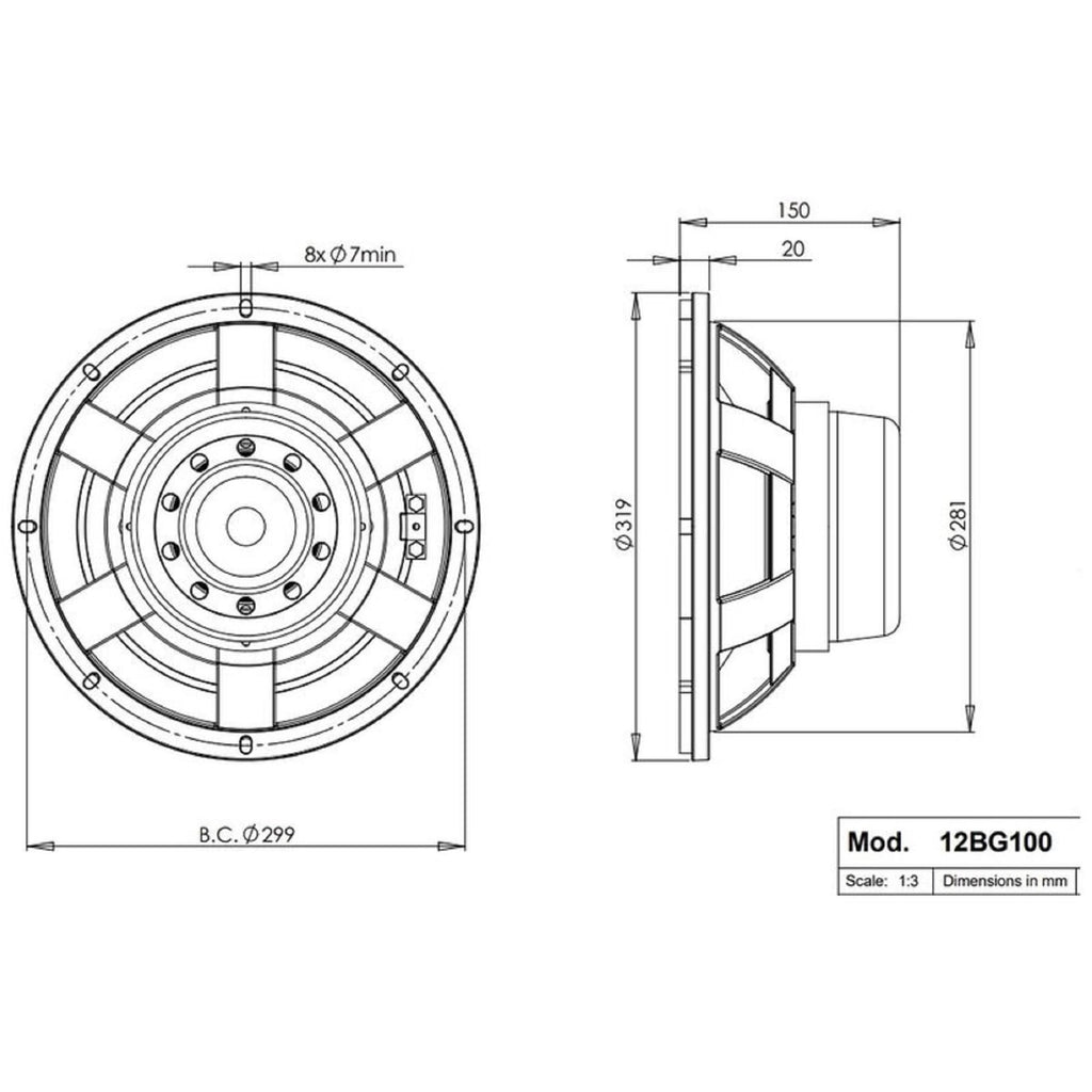 - Overall Diameter: 319 mm (12.5 in). * Bolt Circle Diameter: 299 mm (11.8 in). * Baffle Cutout Diameter: 281.0 mm (11.1 in). * Depth: 137 mm (5.4 in). * Flange and Gasket Thickness: 13 mm (0.5 in). * Air Volume Occupied by Driver: 2.7 dm3 (0.09 ft3). * Net Weight: 8.2 kg (18.0 lb). * Shipping Units: 1. * Shipping Weight: 9.1 kg (20.06 lb). * Shipping Box: 360x360x200 mm (14.17x14.17x7.87 in) * Recone kit: RCK12BG1008"