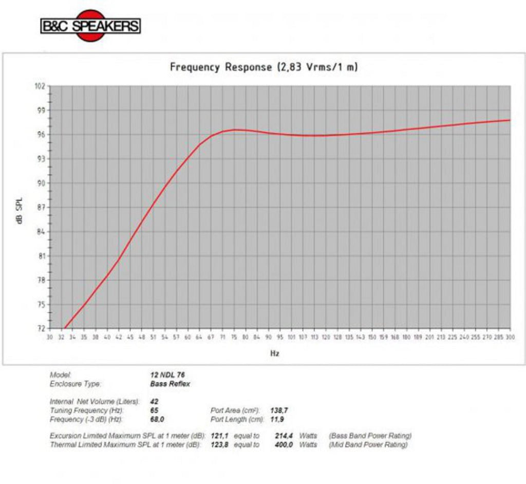B&C Speakers 12NDL76-8 12-inch Woofer 8 Ohms Impedance 400 Watta Rms 800 Watts Max Neodymium Pro Audio Component Speaker Driver for Motorcycle CarHIGHLIGHTS 800 W continuous program power capacity | 76 mm (3 in) aluminium voice coil | 50 - 2000 Hz response | 100 dB sensitivity | Neodymium magnet allows a very light yet powerful motor assembly | Ventilated voice coil gap for reduced power compression | "SPECIFICATIONS Nominal Diameter : 320 mm (12.0 in) | Nominal Impedance : 8 Ω | Minimum Impedance : 6.2 Ω | Nominal Power Handling1 : 400 W | Continuous power handling2 : 800 W | Sensitivity (1W/1m)3 : 100.0 dB | Frequency Range : 50 - 2000 Hz | Voice Coil Diameter : 76 mm (3.0 in) | Winding Material : Aluminium | Former Material : Glass Fibre | Winding Depth : 19.0 mm (0.75 in) | Magnetic Gap Depth : 10.0 mm (0.4 in) | Flux Density : 1.25 T | "DESIGN : | Surround Shape : Double Roll | Cone Shape : Exponential | Magnet Material : Neodymium Inside Slug | Spider : Single | Pole Design : Straight Pole | Woofer Cone Treatment : None | Recommended Enclosure : 42.0 dm3 (1.48 ft3) | Recommended Tuning : 65 Hz |PARAMETERS Resonance Frequency : 50 Hz | Re : 5.3 Ω | Qes : 0.21 | Qms : 4.2 | Qts : 0.2 | Vas : 73.0 dm3 (2.5 ft3) | Sd : 522.0 cm2 (80.9 in2) | η₀ : 4.3 % | Xmax : ± 7.0 mm | Xvar : ± 6.5 mm | Mms : 53.0 g | Bl : 20.1 Txm | Le : 1.0 mH | EBP : 238 Hz |MOUNTING AND SHIPPING INFO || Overall Diameter : 315 mm (12.4 in) | Bolt Circle Diameter : 298 mm (11.7 in) | Baffle Cutout Diameter : 283.0 mm (11.1 in) | Depth : 141 mm (5.5 in) | Flange and Gasket Thickness : 14 mm (0.55 in) | Air Volume Occupied by Driver : 2.5 dm3 (0.08 ft3) | Net Weight : 3.9 kg (8.6 lb) | Shipping Units : 1 | Shipping Weight : 4.8 kg (10.58 lb) | Shipping Box : 360x360x200 mm (14.17x14.17x7.87 in) |