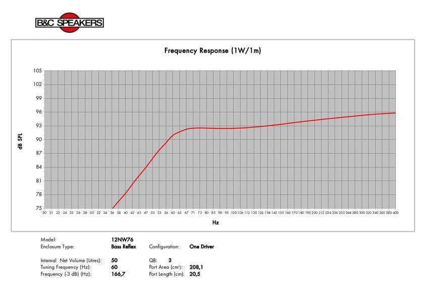 - SPECIFICATIONS Nominal Diameter : 320 mm (12.0 in) | Nominal Impedance : 8 Ω | Minimum Impedance : 6.9 Ω | Nominal Power Handling1 : 500 W | Continuous power handling2 : 1000 W | Sensitivity (1W/1m)3 : 98.5 dB | Frequency Range : 40 - 2000 Hz | Voice Coil Diameter : 76 mm (3.0 in) | Winding Material : Copper | Former Material : Glass Fibre | Winding Depth : 19.0 mm (0.75 in) | Magnetic Gap Depth : 11.0 mm (0.43 in) | Flux Density : 1.3 T |