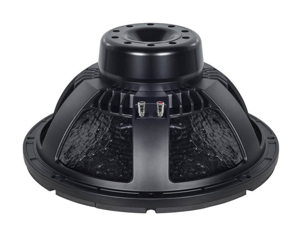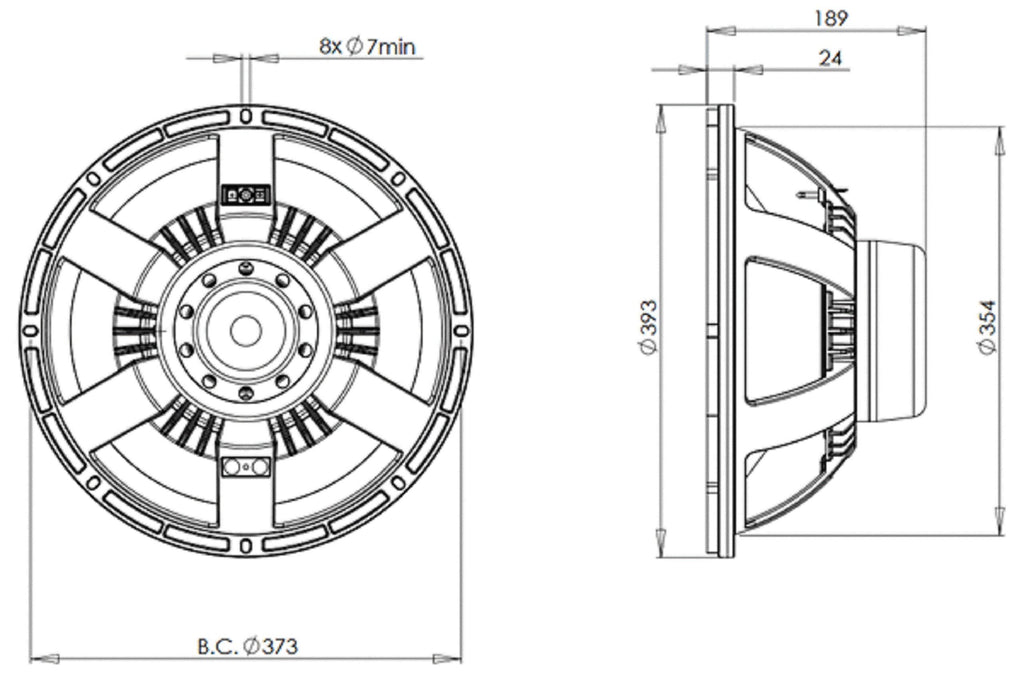 B & C Speakers 15BG100-4 LF Drivers 15 Inch Super Bass Woofer 4 Ohm Neodymium Inside Slug Magnet 2000 Watts Power Capacity 100-mm Copper Voice Coil2000 W continuous program power capacity || 100 mm (4 in) copper voice coil || 35 - 1000 Hz response || 94.5 dB sensitivity || FEA optimized Neodymium magnet assembly || Aluminium demodulating ring for very low distortion || Double silicone spider with optimized compliance || Ventilated voice coil gap for reduced power compressionSPECIFICATIONS || Nominal Diameter :: 380 mm (15.0 in) || Nominal Impedance :: 4 Ω || Minimum Impedance :: 6.0 Ω || Nominal Power Handling 1 :: 1000 W || Continuous power handling 2 :: 2000 W || Sensitivity (1W/1m) 3 :: 93 dB || Frequency Range :: 35 - 1000 Hz || Voice Coil Diameter :: 100 mm (4.0 in) || Winding Material :: Copper || Former Material :: Glass Fibre || Winding Depth :: 27.0 mm (1.05 in) || Magnetic Gap Depth :: 11.0 mm (0.43 in) || Flux Density :: 1.25 TDESIGN || Surround Shape :: Roll || Cone Shape :: Radial || Magnet Material :: Neodymium Inside Slug || Spider :: Double Silicone || Pole Design :: T-Pole || Woofer Cone Treatment :: TWP Waterproof Both Sides || Recommended Enclosure :: 160.0 dm3 (5.65 ft3) || Recommended Tuning :: 29 HzPARAMETERS || Resonance Frequency :: 36 Hz || Re :: 5.1 Ω || Qes :: 0.49 || Qms :: 5 || Qts :: 0.44 || Vas :: 83.0 dm3 (2.93 ft3) || Sd :: 855.0 cm2 (132.5 in2) || η₀ :: 0.8 % || Xmax :: ± 10.5 mm || Xvar :: ± 14.0 mm || Mms :: 240.0 g || Bl :: 23.0 Txm || Le :: 1.6 mH || EBP :: 73 HzMOUNTING AND SHIPPING INFO || Overall Diameter :: 393 mm (15.5 in) || Bolt Circle Diameter :: 374 mm (14.7 in) || Baffle Cutout Diameter :: 354.0 mm (13.9 in) || Depth :: 189 mm (7.44 in) || Flange and Gasket Thickness :: 24 mm (0.94 in) || Air Volume Occupied by Driver :: 6.0 dm3 (0.21 ft3) || Net Weight :: 8.6 kg (18.9 lb) || Shipping Units :: 1 || Shipping Weight :: 9.9 kg (21.83 lb) || Shipping Box :: 425x425x224 mm (16.73x16.73x8.82 in) || SERVICE KIT || Recone kit :: RCK15BG1008