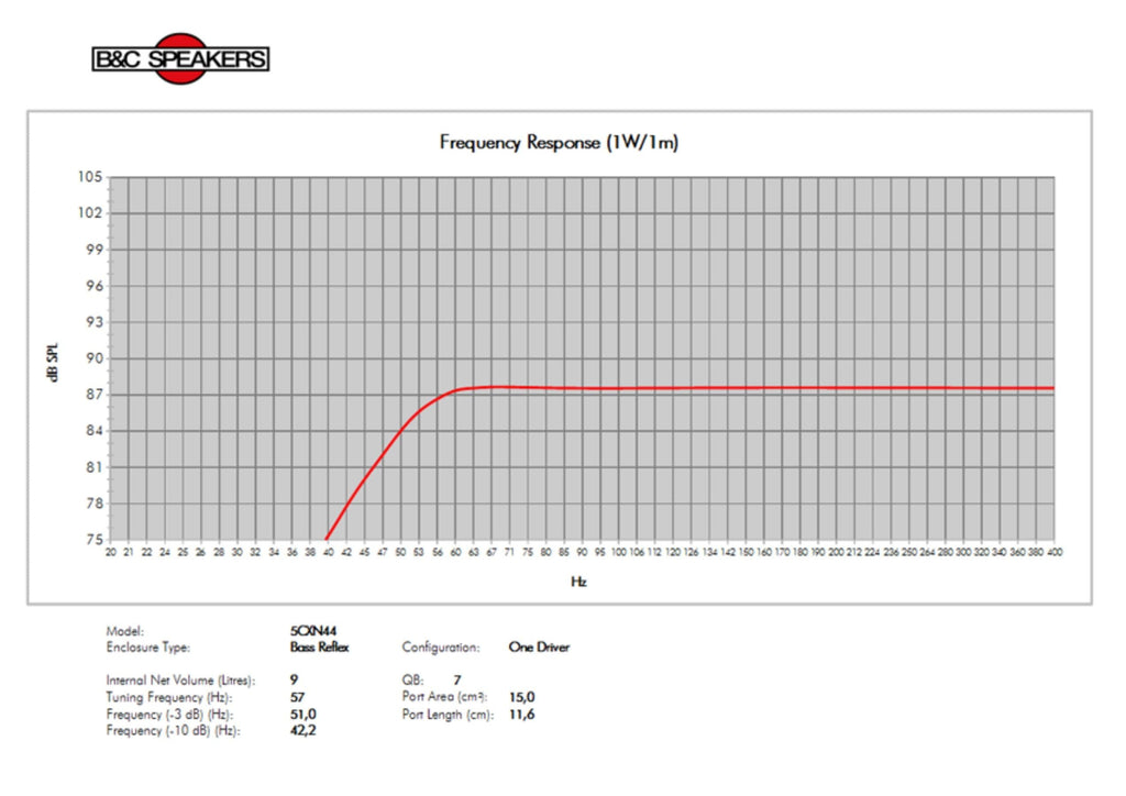 B & C Speakers 5CXN44-8 Coaxials 5-inch 8 Ohms Pro Audio Component Speaker Driver for Motorcycle Car 150 Watts RMS 300 Watts Max Neodymium MagnetHIGHLIGHTS | 300 W continuous program power capacity | 80° nominal coverage | 70 - 18000 Hz response | 86.5 dB sensitivity | Aluminium demodulating ring for very low distortion"SPECIFICATIONS : | Nominal Diameter : 127 mm (5.0 in) | Nominal Impedance : 8 Ω | Minimum Impedance LF : 6.1 Ω | Minimum Impedance HF : 7.5 Ω | Frequency Range : 70 - 18000 Hz | Dispersion Angle1 : 80 ° | Woofer Cone Treatment : WP Waterproof Front Side | Magnet Material : Neodymium Ring | "SPECIFICATIONS LF UNIT : | LF Sensitivity2 : 86.5 dB | LF Nominal Power Handling3 : 150 W | LF Continuous Power Handling4 : 300 W | LF Voice Coil Diameter : 44 mm (1.7 in) | LF Winding Material : Copper | LF Flux Density : 0.95 T | Former Material : Kapton | Winding Depth : 14.0 mm (0.55 in) | Magnetic Gap Depth : 6.0 mm (0.24 in) | "SPECIFICATIONS HF UNIT : | HF Sensitivity5 : 101.0 dB | HF Nominal Power Handling6 : 25 W | HF Continuous Power Handling7 : 50 W | HF Voice Coil Diameter : 36 mm (1.4 in) | HF Winding Material : Aluminum | HF Flux Density : 1.54 T | Diaphragm Material : HT Polymer | Recommended Crossover8 : 2.0 kHz | Inductance : 0.14 mH | "MOUNTING AND SHIPPING INFO : | Overall Diameter : 155 mm (6.1 in) | Bolt Circle Diameter : 142 mm (5.6 in) | Baffle Cutout Diameter : 122 mm (4.8 in) | Depth : 96 mm (3.78 in) | Flange and Gasket Thickness : 10 mm (0.39 in) | Net Weight : 1.2 kg (2.65 lb) | Shipping Units : 1 | Shipping Weight : 1.65 kg (3.64 lb) | Shipping Box : 255x255x150 mm (10.04x10.04x5.91 in) | "