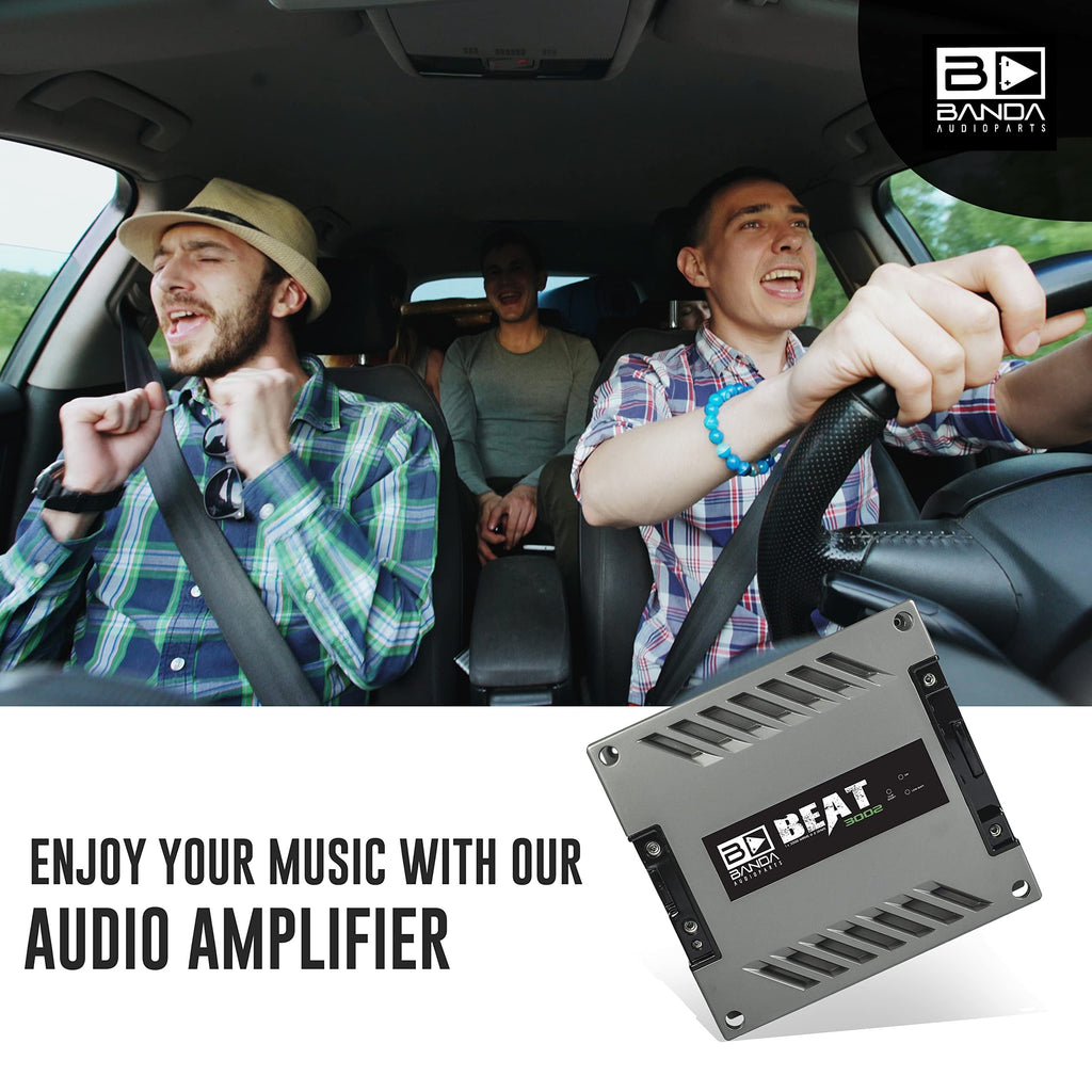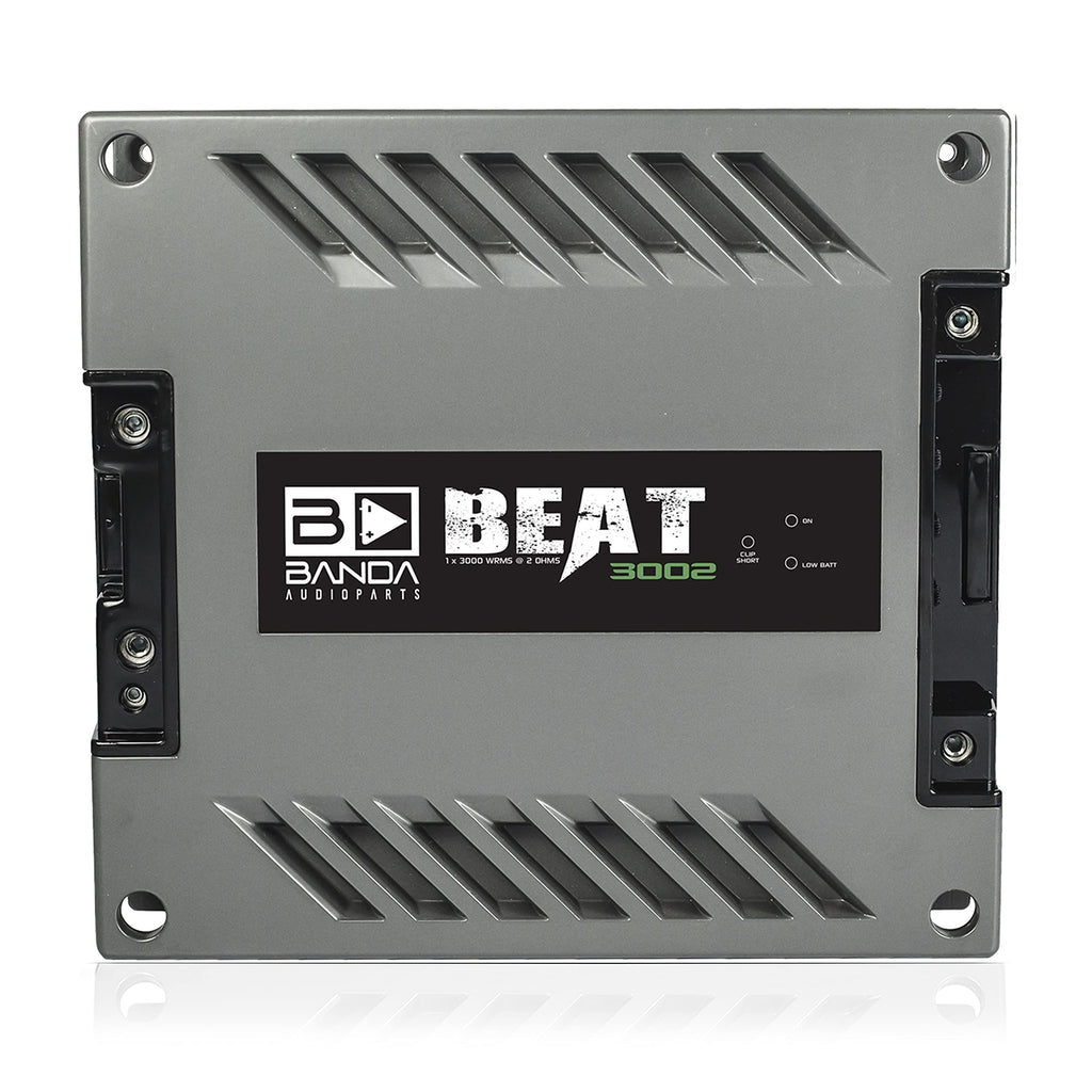 Banda 1-Channel Vehicle Audio Amplifier - 3000 Watts High-Powered Mono Bass Amplifier w/Subsonic Filter and Low Pass Filter Stable at 2 ohms, LED Indicators, Sound Specialization BEAT3002POWER SUPPLY: Class D vehicle audio amplifier, Total Power 14.4 @ 2 Ohms: 3500 WRMS, Total Power 14.4 @ 4 Ohms: 2600 WRMS, Total Power 12.6 @ 2 Ohms: 3000 WRMS, Total Power 12.6 @ 4 Ohms: 2150 WRMS, Efficiency @ 2 Ohms: 72%, Efficiency @ 4 Ohms: 81%CAR AUDIO AMPLIFIER INDICATORS: Blue LED: source and powered amplifier indicator, Red LED: output distortion (clipping), shorting and thermal protection indicator, Yellow LED: below specified voltage indicator (flashing)POWER OUTPUT AND IMPEDANCE: Input Voltage: 9 to 15V, Input Impedance: 100K Ohms, THD + Noise: less than 1%, Input Sensitivity: 135mV to 4V, Signal to Noise Ratio: 80dBSOUND SPECIALIZATION: This high-powered Power Amplifier is cutting edge technology at its finest. RCA connectors ensure a secure connection between amplifier and speakers that allow distortion-free soundOTHER TECHNICAL SPECS: Recommended Fuse: 150A, Current at Rest: 1.5A, Ave. Current Draw (Sinusoidal): 360 A, Ave. Current Draw (Music): 180 A, Power Wire Gauge: 21mm/4 AWG, Speaker Wire Gauge: 2 x 4mm/2 x 11 AWG, Size: 9.7'' x 8.4'' x 2.2'' -inches