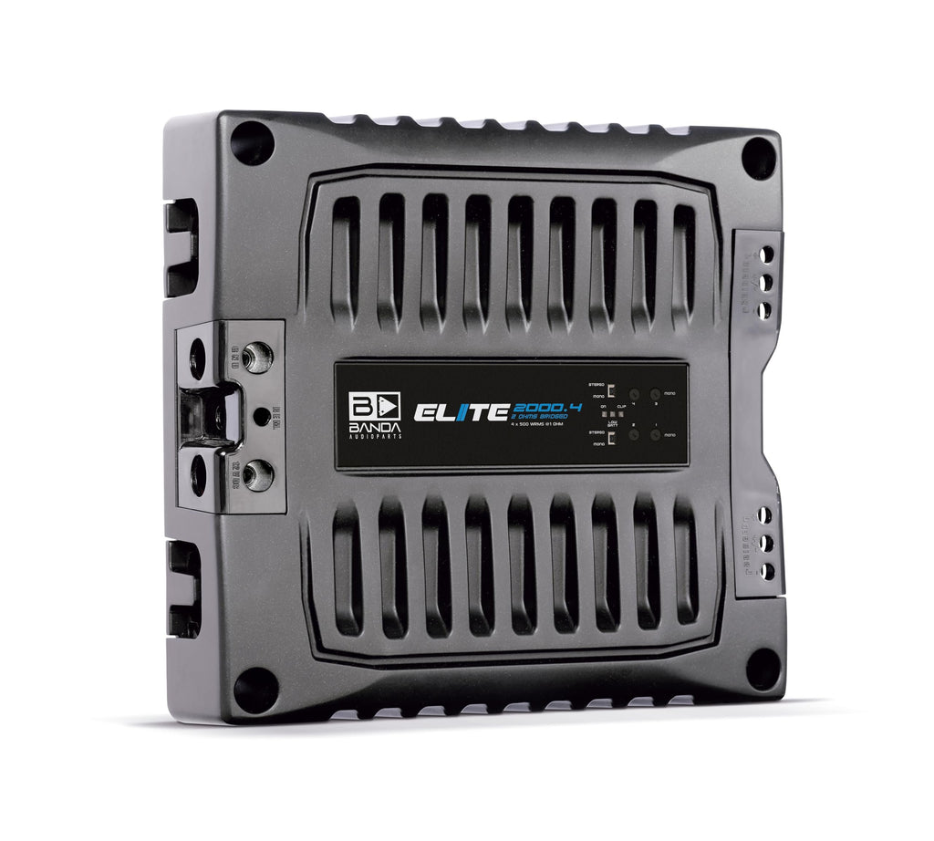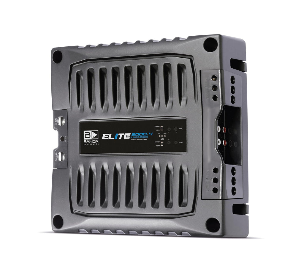 BANDA Audioparts ELITE2000.41OHM Class D Audio Amplifier Elite 2000.4 Four Channel 500 Watts Max 1-Ohm Car Audio Amp BlackGENERAL || * Brand : BANDA Audioparts || * Model Number : 2000.41OHM | ELITE2000.41OHM || * UPC : 7898963506379 | 7898713132032 || * COLOR : BLACK ||FEATURES || * Total Power 14,4 @ 1 Ohm : 4 x 600 WRMS || * Total Power 14,4 @ 2 Ohms : 4 x 400 WRMS || * Total Power 144 Bridged : 2 x 1250 WRMS 2 ohm || * Total Power 126 @ 1 Ohm : 4 x 500 WRMS || * Total Power 126 @ 2 Ohms : 4 x 300 WRMS || * Total Power 126 Bridged : 2 x 1000 WRMS 2 ohm || * Efficiency @ 2 Ohms : 81% || * Efficiency @ 1 Ohm : 76% ||* Input Voltage : 9 - 15V || * Input Impedance : 100K Ohms || * THD+NOISE : 0.10% * Input Sensitivity : 220mV - 4V || * SNR : 80dB || * Frequency Response : 5Hz to 22kHz (-3dBs) || * HPF (High Pass Filter)HPF (High Pass Filter) : 20 to 90Hz @ 12dB/octave Linkwitz-Riley || * LPF (Low Pass Filter)LPF (Low Pass Filter) : 90 to 20kHz @ 12dB/octave Linkwitz-Riley ||* Recommended Fuse Recommended Fuse : 100 A || * Current at Rest Current at Rest : 1A || * Average Current Draw (Sinusoidal)Average Current Draw (Sinusoidal) : 210 A || * Average Current Draw (Music)Average Current Draw (Music) : 100 A || * Power Wire Gauge (min. Recommended) Power Wire Gauge (min. Recommended) : 21mm / 4 AWG || * Speaker Wire Gauge (min. Recommended) Speaker Wire Gauge (min. Recommended) : 2 x 2.5mm / 2 x 13 AWG ||DIMENSION || * Weight (Lb)Weight (Lb) : 3.3 || * Height (in)Height (in) : 54 || * Width (in)Width (in) : 209 || * Depth (in): 243