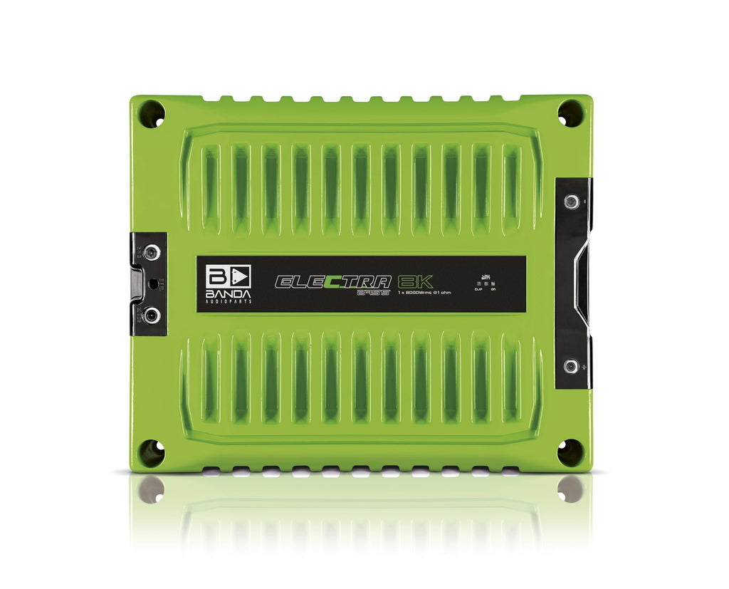 GENERAL || Brand : BANDA || Model Number : ELEC8K1GREEN || UPC : 7898713131493 || SPECIFICATIONS || Maximum Power at 14.4V @ 1 Ohm : 9000-W rms || Maximum Power at 14.4V @ 2 Ohms : 7400-W rms || Maximum Power at 12.6V @ 1 Ohm : 8000-W rms || Maximum Power at 12.6V @ 2 Ohms : 5100-W rms || Efficiency @ 2 Ohms : 83% || Efficiency @ 1 Ohm : 77% || Input Voltage : 9 - 15V || Input Impedance : 100K Ohms || Maximum THD at Full Power : <3% || Input Sensitivity : 200mV to 8V ||