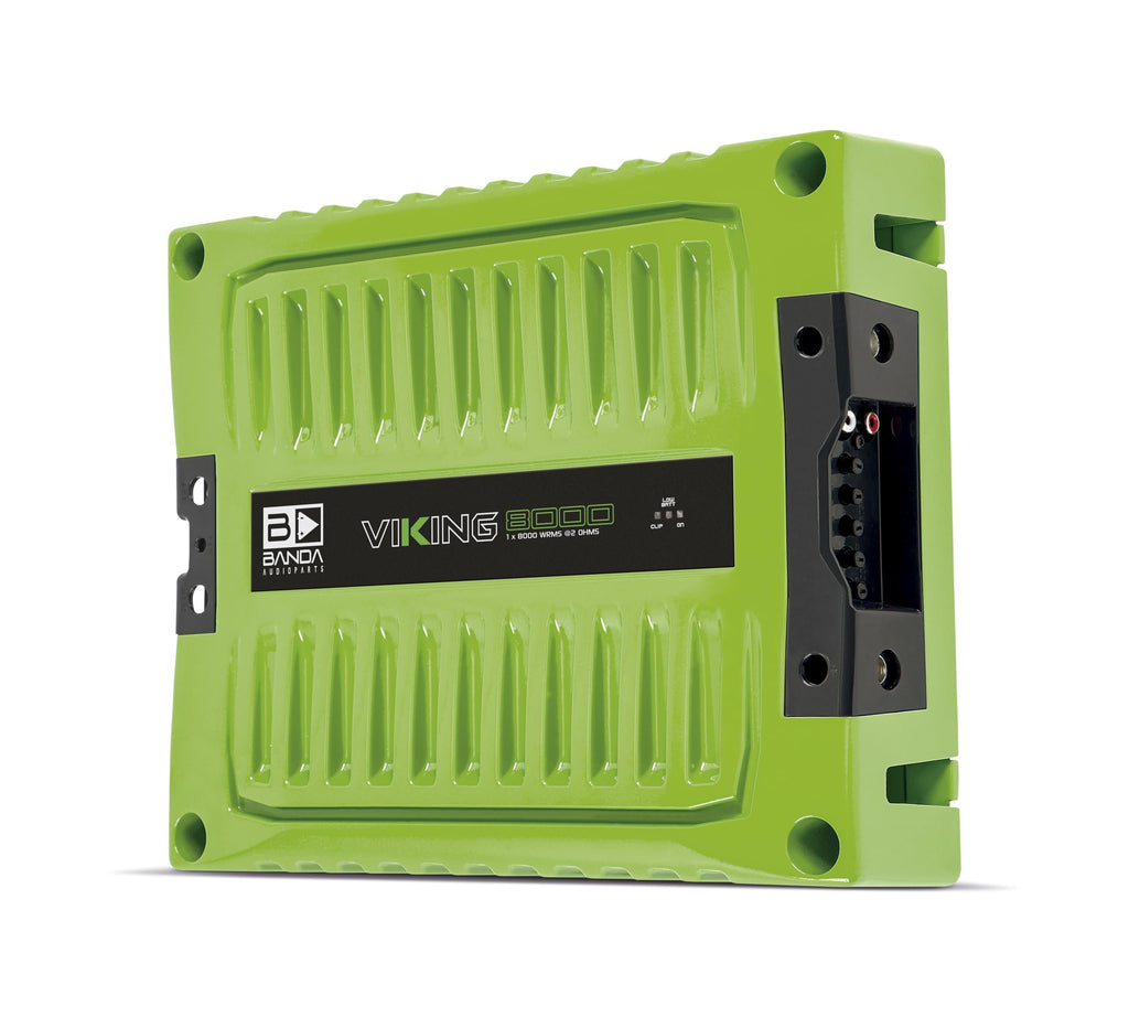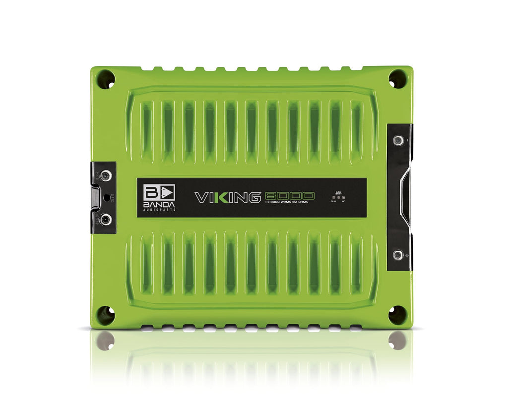 Banda VIK8000.2GREEN Car Amplifier Audio Speaker 2-Ohms Full Range New Viking 8000 Watts Rms LED Indicator Sound Specialization Aluminum Chassis - GreenGENERAL || Brand : BANDA || Model Number : VIK8000.2GREEN | VIKING 8000 || UPC : 7898713131462 || SPECIFICATIONS || Maximum Power at 12.6V @ 2 Ohm : 8000 Watts RMS || Maximum Power at 12.6V @ 4 Ohms : 5100 Watts RMS || Maximum Power at 14.4V @ 2 Ohm : 9000 Watts RMS || Maximum Power at 14.4V @ 4 Ohms : 6800 Watts RMS || Weight (Kg) : 6.3 | 13.9 lbs || Height (cm) : 7.3 | 2.8 (in) || Width (cm) : 25.6 | 10 (in) || Depth (cm) : 31.7 | 12.5 (in) ||TECHNICAL SPECIFICATIONS || Operating Class: Class D || Efficiency @ 4 Ohms : 88% || Efficiency @ 2 Ohm : 79% || Input Voltage : 9 - 15V || Input Impedance : 100K Ohms || Total Harmonic Distortion + Noise : ~3% || Input Sensitivity : 200mV to 8V || Signal-to-Noise Ratio : 80dB || Frequency Response: 16 to 16kHz (-3dB) || High-Pass Filter (Subsonic) : 16 - 120Hz @ 12dB/octave Linkwitz-Riley || Low-Pass Crossover : 50 - 16kHz @ 12dB/octave Linkwitz-Riley ||TECHNICAL SPECIFICATIONS || Variable Bass Boost : 30 - 80Hz with up to 12dB boost || Recommended Fuse : 2 x 225A || Standby Current Draw : ~3A || Maximum Current Draw (Musical Signal) : 400A || Sinusoidal Current : 850A || Minimum Recommended Power Cable : 70mm / 0 AWG || Minimum Recommended Output Cable : 2 x 6mm / 2 x 3 AWG || Gain Control || Differential Input Signal || Forced Ventilation with Micro Fans ||The VIKING line is tailored for those seeking potent and powerful sound. In this line, you will find models that have garnered recognition in top-tier international competitions. || The Viking 8000 delivers an impressive 8000Wrms in a single channel at 2 Ohms, making it a preferred choice for large-scale projects due to its high-performance capabilities. It features a wide frequency response ranging from 16Hz to 16kHz, making it adaptable for driving various types of speakers. ||Crafted with a 100% aluminum chassis, the Viking 8000 offers superior heat dissipation, resulting in lower battery consumption and exceptional performance.