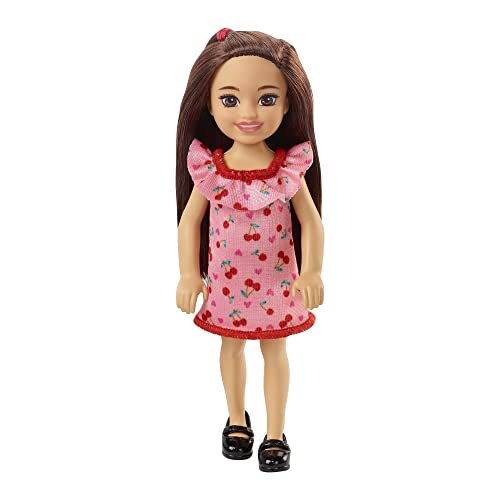 Barbie Chelsea Doll (Brunette) Wearing Ruffled Cherry-Print Dress and Black Shoes, Toy for Kids Ages 3 Years Old & Up