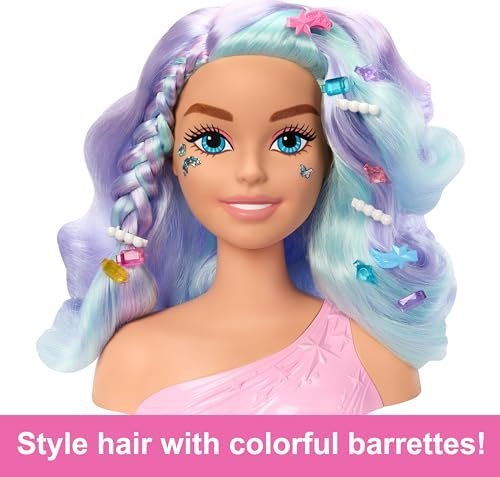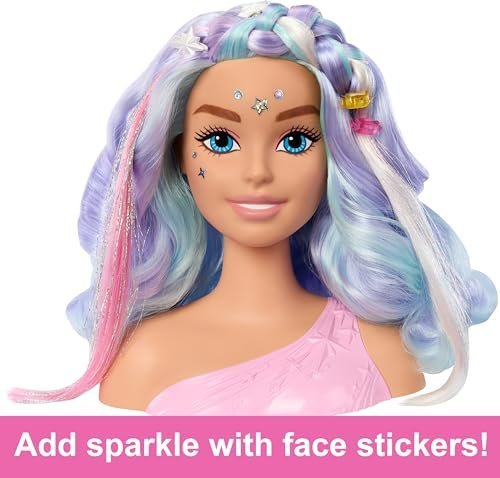 Barbie Doll Head for Hair Styling, Pastel Fantasy Hair with 20 Fairytale-Inspired Accessories Including Shimmer Stickers