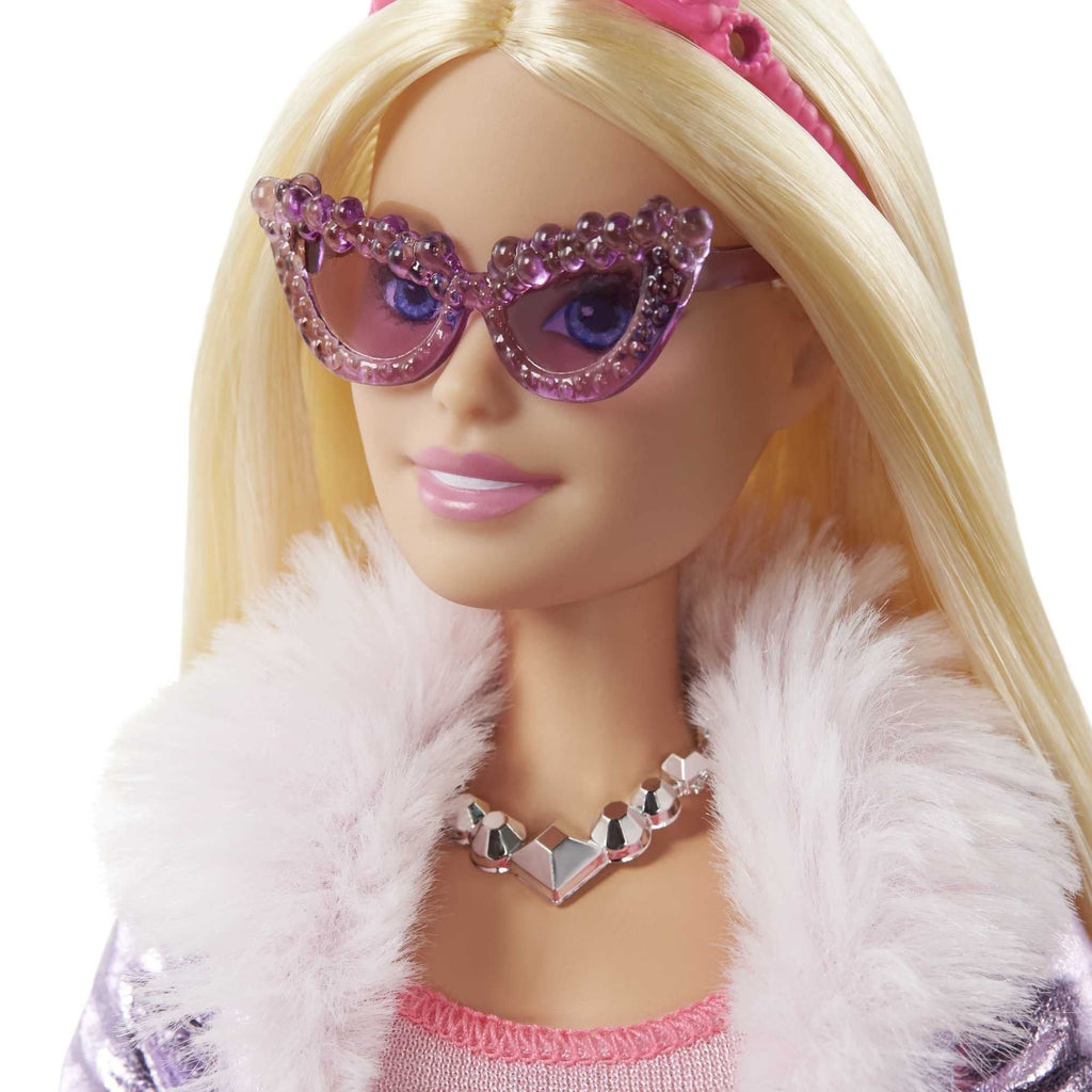 - Barbie doll puts a trendy twist on her princess look in a full skirt with sparkly graphics, a fur-lined metallic jacket and bright blue high-tops.