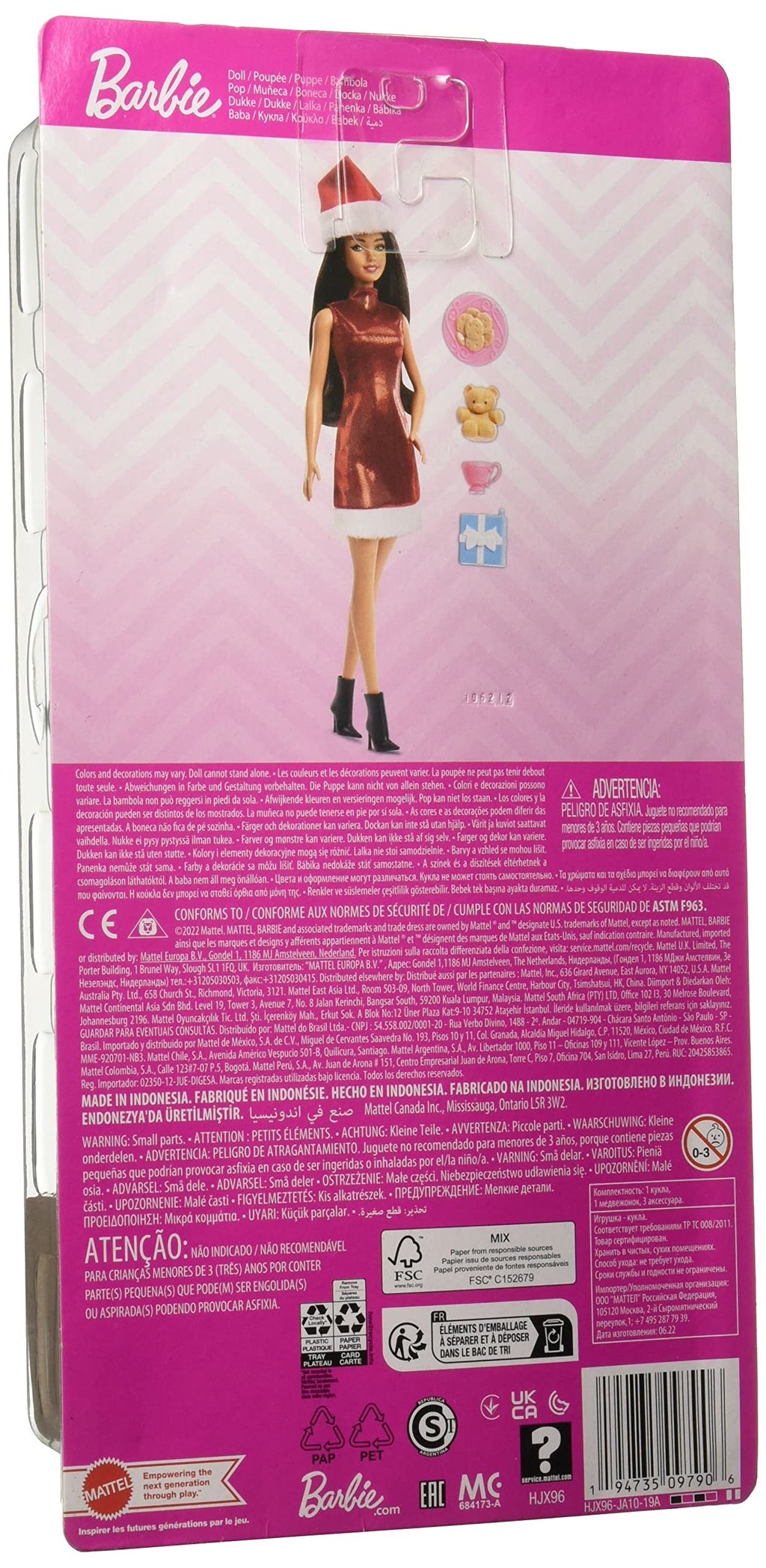 Ring in the season with Barbie Santa doll! Wearing a festive red dress trimmed with white faux fur and a cute matching Santa hat, Barbie Santa doll captures all the spirit and fun of the holidays. Doll also comes with these fun pieces: a teddy bear, gift and milk and cookies. Kids will love playing out holiday storytelling moments with the accessories. Makes a great holiday gift for Barbie fans of all ages. Doll cannot stand alone. Colors and decorations may vary. For kids 3 to 8 years old.
