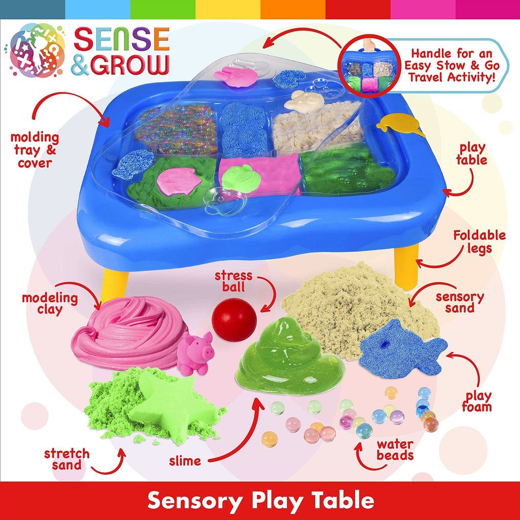 - We Bring It All to the Table: Explore the wonderful textures of many different sensory items with a unique activity table that indulges the sense of touch; Read all about the benefits of this kit with the Sense & Grow guide to sensory play that’s attached to each box