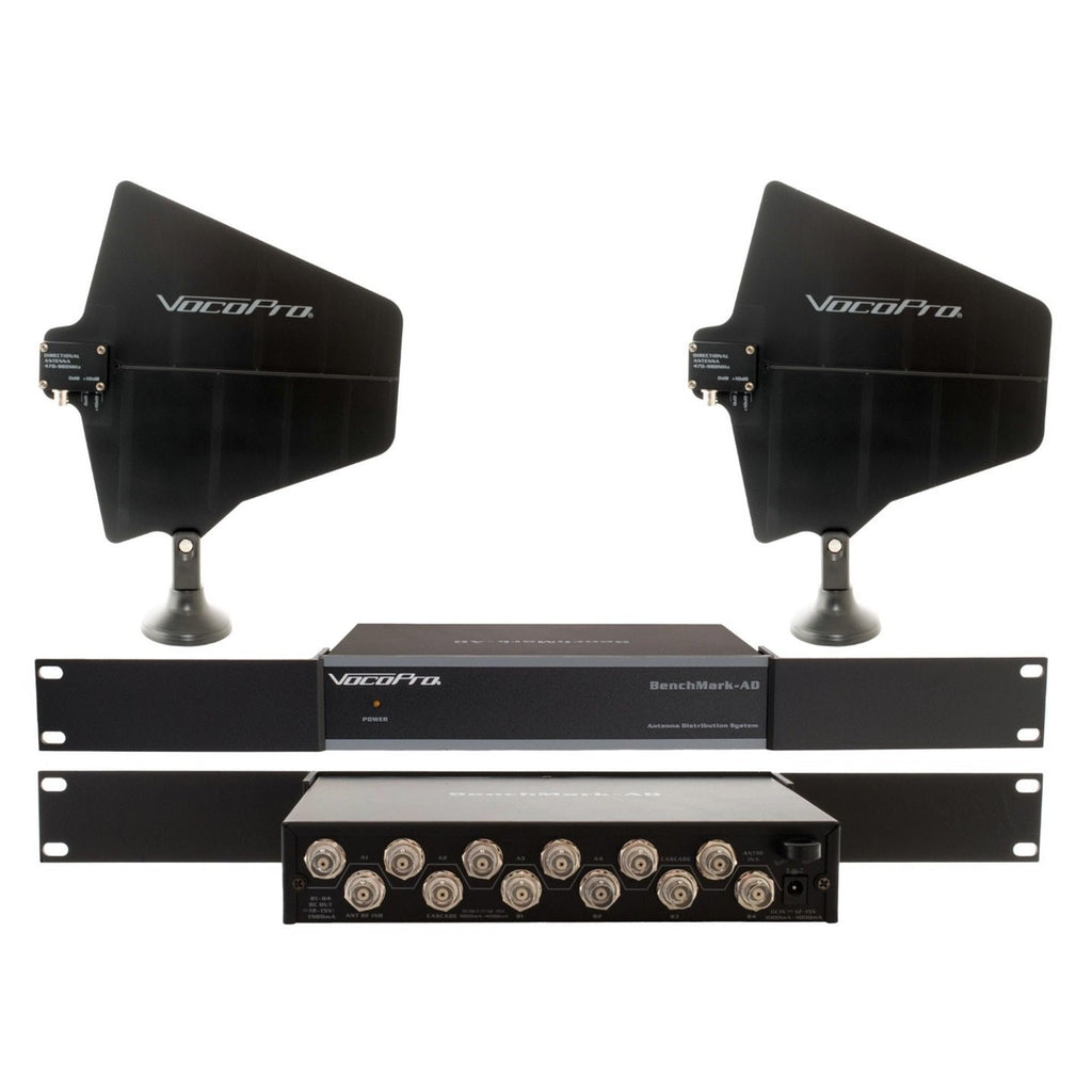 The VocoPro Benchmark-AD Professional Antenna Distribution System with 2 Active Directional Antenna Bundle is a cutting-edge system designed to distribute active antennas, allowing multiple wireless microphone receivers from any brand to utilize a single pair of directional fin antennas. With the capability to connect up to 10 single antenna wireless receivers or 5 dual antenna wireless receivers across the UHF spectrum, this professional bundle offers unparalleled convenience and flexibility. By replacing multiple whip antennas with a single pair of directional fin antennas, the BENCHMARK-Antenna Distributor effectively minimizes RF reflections and crosstalk bleed, which are common culprits behind signal dropouts. Additionally, the internal booster amplifier significantly extends the range of the wireless receivers, providing up to four times the coverage area. For larger setups, up to 3 Benchmark-AD units can be combined to support multiple wireless microphone receivers, all utilizing a single pair of directional antennas. The package includes both BNC and TNC type antenna adapters, as well as connection cables, ensuring compatibility with the majority of wireless microphone systems available in the market. With its advanced features and comprehensive compatibility, the BENCHMARK-Antenna Distributor is the ideal solution for professional audio setups requiring efficient antenna distribution.
