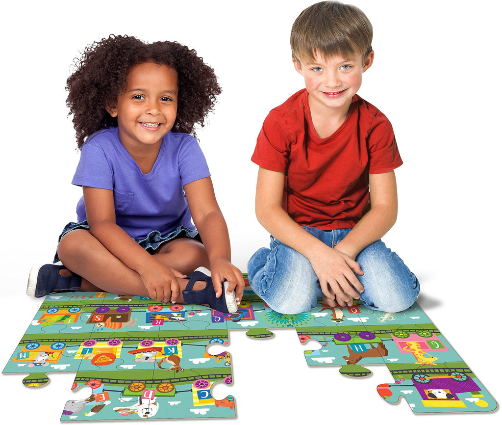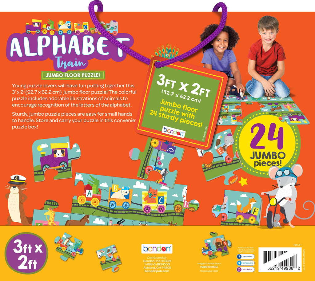 Bendon Alphabet Letter Train Shaped Jumbo Jigsaw Floor Puzzle (24 pcs, 3 x 2 feet Long) - Kids Vehicle Puzzles, Large Floor Puzzles for Preschoolers and Kids Ages 3+INCLUDES: 24-piece jumbo floor puzzleSTORAGE BOX: Display box with handle is perfect for travel and storageSIZE: 3' x 2' finished puzzle sizeJUMBO PIECES: Jumbo puzzle pieces are perfect for little handsIDEAL FOR: Children ages 3 years and up