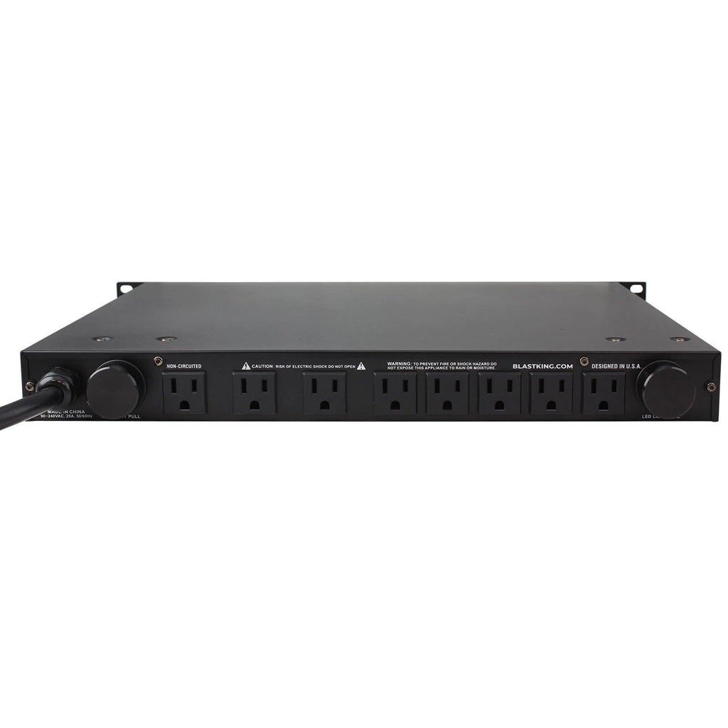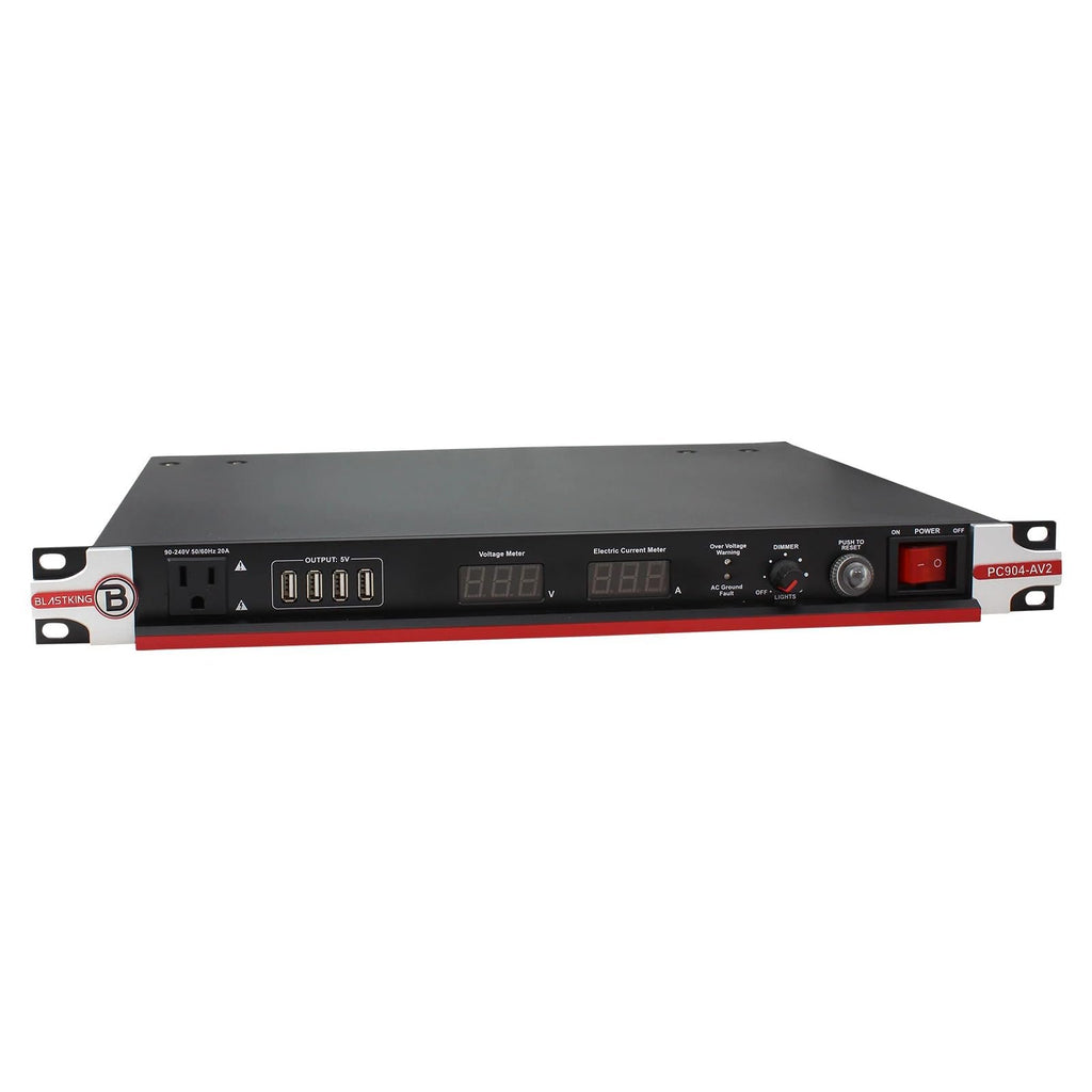 Blastking PC904-AV2 20 Amp Power ConditionerProduct Description || THE FIRST POWER CONDITIONER IN THE WORLD TO ILLUMINATE THE FRONT AND BACK OF YOUR RACK ||KEY FEATURES || Surge suppressor and AC filter with 8 back-panel outlets and 1 front outlet || Filtration of noise from radio frequencies and electromagnetic interference || Voltage meter LED indicator || Electric current meter LED indicator || Front and back lights || EXCLUSIVE BLASTKING DESIGN ||SPECIFICATIONS || WORLDWIDE VOLTAGE INPUT 90-240V 9 POWER OUTLETS 20 Amps || 4 USB 5V Charge Ports || 3 Digit Amp Meter || Ground Status Indicator || Over Current Indicator || Push to Reset Breaker ||SPECIFICATIONS || Dimmable LED Bar Light || 50-60 Hz Ready || 1 Rack Space || 2 Rear 9” / 23cm Pull Out LED Lights || Power Switch with Barriers to Avoid Accidental On/Off || 125 cm / 49 inch Heavy Duty Power Cord || Exclusive Design ||Physical Dimensions and Weight || Weight: 8.6 Lbs / 3.9 kg || Dimension (WXHXL): 19” X 1.73” X 15” / 482.6 X 44 X 381 CM || Package Dimensions and Weight || Weight: 10.3 Lbs / 4.7 kg || Dimension (WxHxL): 21.5” x 4” x 18” / 546.1 x 101.6 x 457.2 cm || Barcode: 686811894948 ||