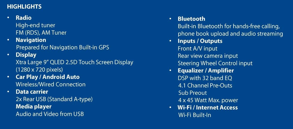 HIGHLIGHTS || RADIO : High-End Tuner | FM (RDS), AM Tuner || NAVIGATION : Prepared for Navigation Built-in GPS || DISPLAY : Floating 9-inch QLED 2.5D Touch Screen Panel (1280 x 720 pixels) || CARPLAY / ANDROID AUTO : Wireless / Wired Connection || DATA CARRIER : 2x Rear USB (Standard A-Type) || MEDIA PLAYER : Audio and Video from USB || BLUETOOTH : Built-in Bluetooth for hands-free calling | phonebook upload and audio streaming ||