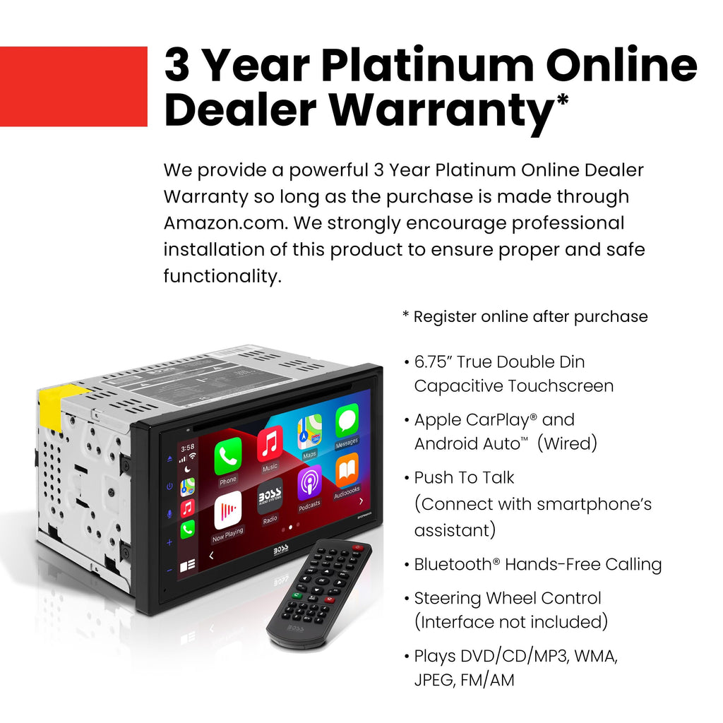 BOSS Audio Systems BVCP9690A Car Stereo - Apple CarPlay, Android Auto, Double Din, 6.75 Inch Touchscreen, Bluetooth, CD DVD Player, AM/FM Radio Receiver, Wireless Remote Control, USB