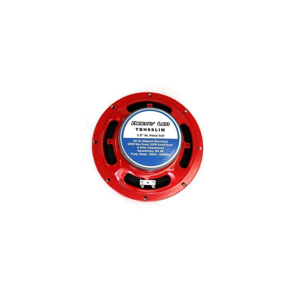 Deejay LED TBH8SLIM 8" Diameter Slim Application Woofer with High Strength Ferrite Magnet, 4Ohm Cloth double rolled edge paper cone 360 Watts Rated power with 600 Watt peak power rating Stamped steel basket Eight mounting holes