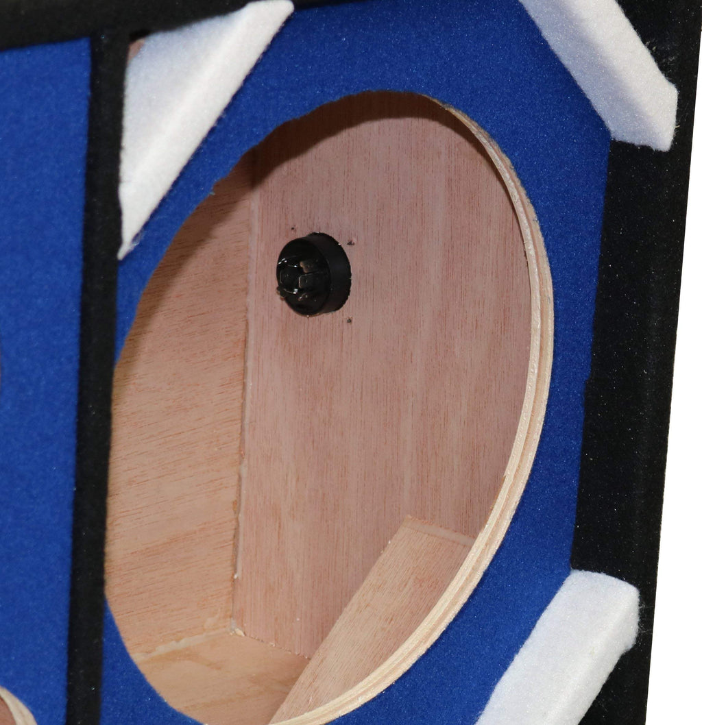 - Heavy duty carpet with quality embroidered stitched logo, 12mm plywood heavy duty construction, 6.625-in available speaker depth, 9.125-in round openings for two 10-in woofers