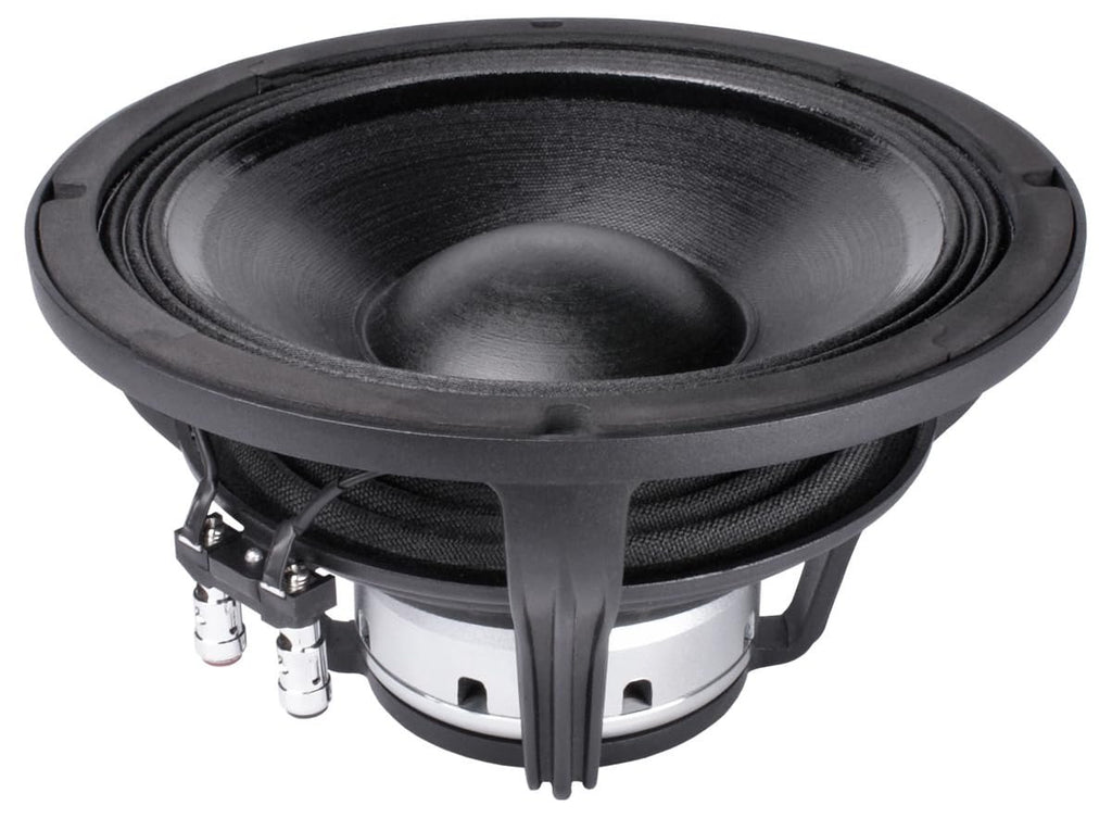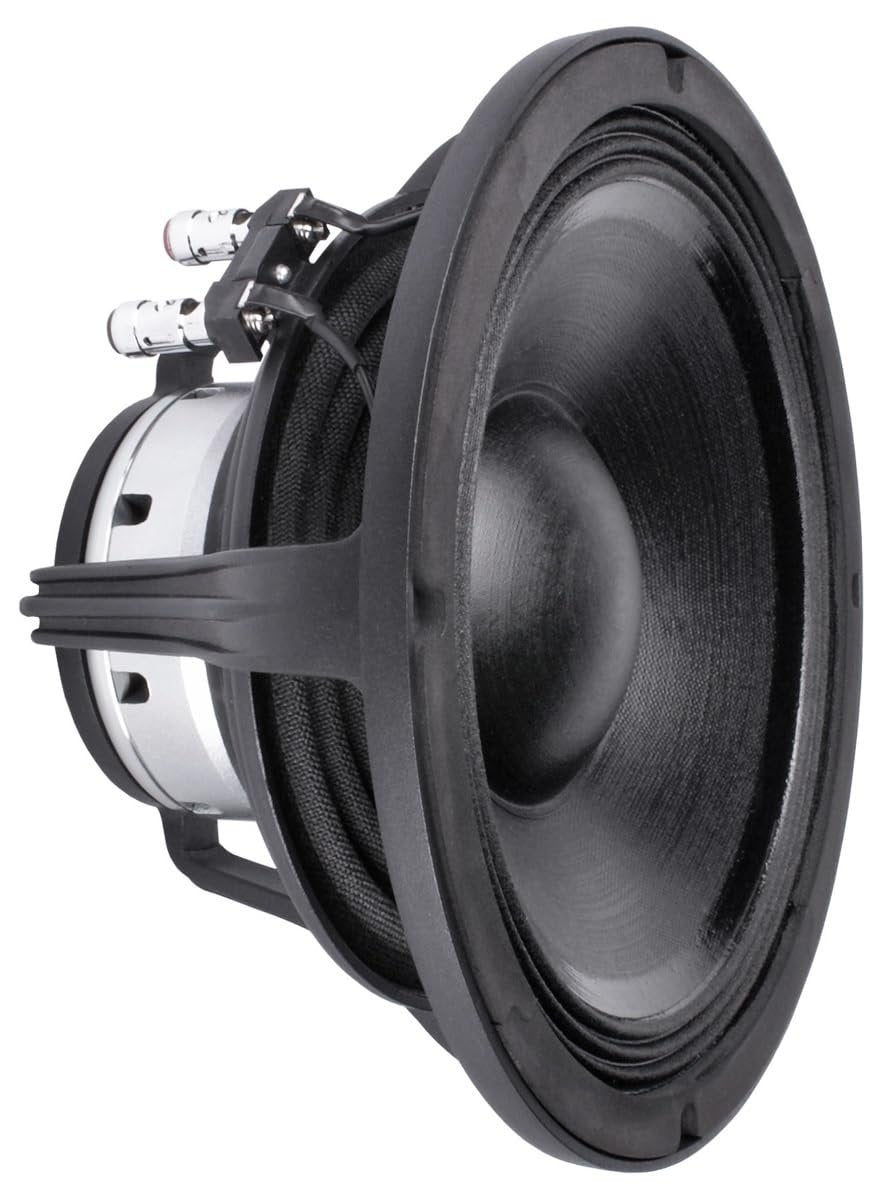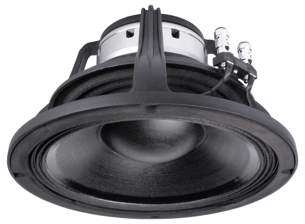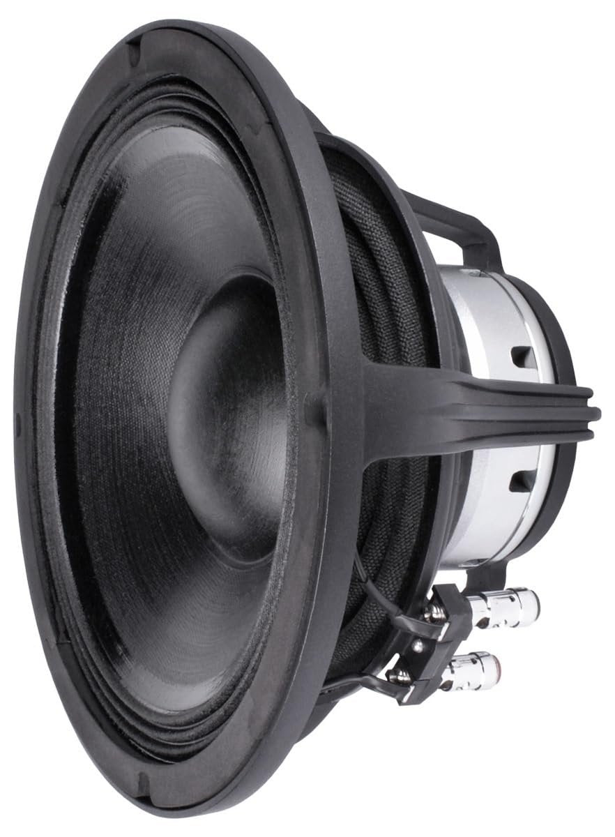 Deejayled FAITAL PRO 10HP1020-8 NEO Woofer 10-inch Professional Audio Midbass Midrange Applications 8-Ohm 700 Watts Rms 1400 Watts Peak PowerFEATURES || * Brand : FAITALPRO || * Model Number : 10HP1020-8 || 10HP1020 || * PART NUMBER (P/N) || Push Terminals - 8 Ohm Version : 02503939 || A 4-inch, aluminum voice coil and a lightweight, powerful neo slug motor A triple roll, treated polycotton cone surround for smooth response and extended excursion An open cast aluminum frame for reduced weight and improved cooling A distortion and inductance reducing aluminum demodulation ringNOMINAL SPECIFICATIONS || Nominal Diameter : 250 mm (10 in) || Overall Diameter : 261 mm (10.28 in) || Bolt Circle Diameter : 246 mm (9.69 in) || Baffle Cutout Diameter : 232 mm (9.13 in) || Depth : 141.3 mm (5.56 in) || Flange and Gasket Thickness : 12.5 mm (0.49 in) || Net Weight : 5.2 kg (11.5 lb) || ""Shipping Box (Single Carton Box) : 294 x 290 x 203 mm (11.6 x 11.4 x 8.0 in) || "" Shipping Weight : 5.8 kg (12.8 lb) ||TECHNICAL PARAMETERS || Nominal Impedance : 8 Ohm || Minimum Impedance : 7.3 Ohm || AES Power Handling (1) : 700 W || Maximum Power Handling (2) : 1400 W || Sensitivity (1W/1m) : 96 dB || Frequency Range : 60÷2500 Hz || Voice Coil Diameter : 100 mm (4 in) || Winding Material : Al || Former Material : Glass Fiber || Winding Depth : 22 mm (0.87 in) ||TECHNICAL PARAMETERS || Magnetic Gap Depth : 12 mm (0.47 in) || Flux Density : 1.3 T || Magnet : Neodymium Slug || Basket Material : Aluminum || Demodulation : No || Cone Surround (3) : M-Roll || NET Air Volume filled by Loudspeaker : 2.2 dm^3 (0.078 ft^3) || Spider Profile : 2x non-adjacent symmetrical constant height waves ||THIELE AND SMALL PARAMETERS || Fs : 60 Hz || Re : 5.5 Ohm || Qes : 0.25 || Qms : 6.5 || Qts : 0.24 || Vas : 16.1 dm^3 (0.57 ft^3) || Sd : 345 cm^2 (53.48 in^2) || Xmax (4) : 9.00 mm || Xdamage (5) : 18.2 mm || Mms : 72.5 g || Bl : 24.5 N/A || Le : 0.85 mH || Mmd : 65.3 g || Cms : 0.10 mm/N || Rms : 4.2 kg/s || Eta Zero : 1.35 % || EBP : 240 Hz ||
