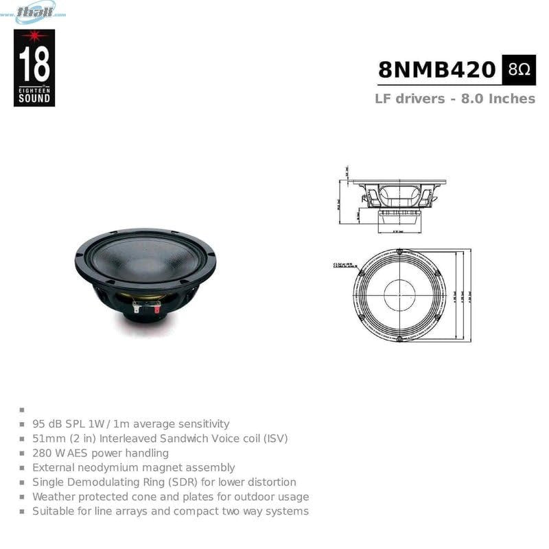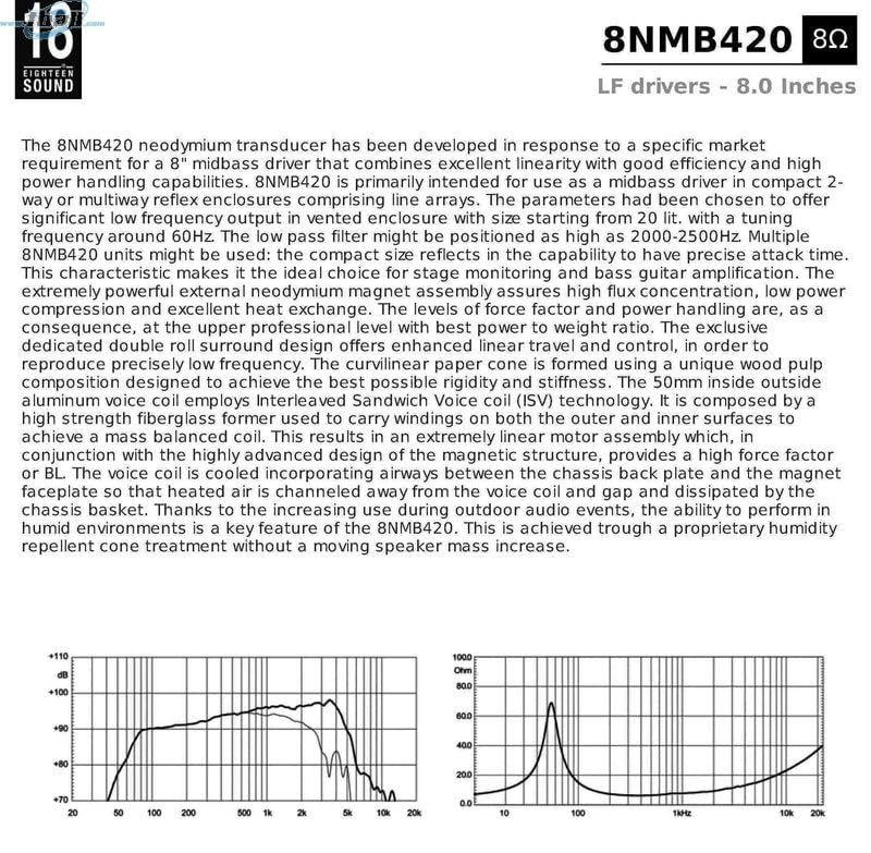 - 8NMB420 neodymium transducer has been developed in response to a specific market requirement for a 8" midbass driver that combines excellent linearity w/ good efficiency & high power handling capabilities. 8NMB420 is primarily intended for use as a midbass driver in compact 2- way or multiway reflex enclosures comprising line arrays. Parameters had been chosen to offer significant low frequency output in vented enclosure w/ size starting from 20 lit. w/a tuning frequency around 60Hz.