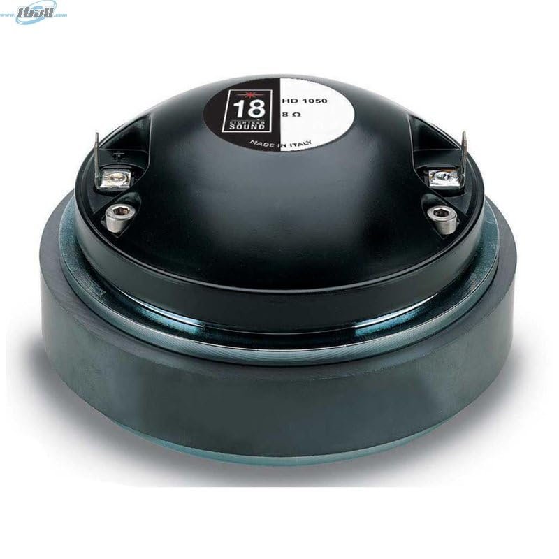 Eighteen Sound HD1050-8 1-inch Exit Throat Driver 8-Ohms Pro Audio Components Speakers Drivers for Motorcycle Car Audio Applications 50 RMS 100-Watt PeakFEATURES || 107 dB SPL 1W / 1m average sensitivity || 1 inch exit throat || 44 mm (1 3/4 inch) voice coil diameter || 100 Watt program power handling || Titanium dome over PEN suspension || Proprietary phase plug design ||"SPECIFICATIONS || Throat Diameter :: 25 mm (1.0 in) || Nominal Impedance :: 8 Ω || Minimum Impedance :: 6.4 Ω || Nominal Power Handling :: 50 W || Continuous Power Handling :: 100 W || Sensitivity :: 107.0 dB || Frequency Range :: 1.6 - 20.0 kHz || Recommended Crossover :: 1.4 kHz || Voice Coil Diameter :: 44 mm (1.75 in) || Winding Material :: Aluminum || Diaphragm Material :: Titanium - Pen || Flux Density :: 1.6 T || Magnet Material :: Ferrite || ""MOUNTING AND SHIPPING INFO || Overall Diameter :: 110 mm (4.33 in) || Depth :: 60 mm (2.36 in) || Net Weight :: 1.6 kg (3.53 lb) || Shipping Weight :: 1.7 kg (3.75 lb) || Shipping Box :: 110x110x63 mm (4.33x4.33x2.48 in) ||"The HD1050 one inch exit high frequency compression driver has been designed for use in high quality audio systems. Equipped with Eighteen Sound proprietary Phase Plug architecture, the HD1050 has been designed to give high level manufacturing consistency and smooth coherent wave front at the horn entrance across the whole working frequency range. The phase plug with its short openings and high flare rate value assures low distortion and demonstrates remarkable improvementsThe diaphragm assembly is composed of a titanium dome sandwiched to a proprietary treated polyester suspension unit. It has been designed to maintain low resonance, lowering the minimum crossover point value at 1,4kHz. An edge-wound aluminum voice coil, wound on proprietary treated Nomex, completes the diaphragm assembly. Thanks to its physical properties, the proprietary treated Nomex former has a 30% higher value of tensile elongation at a working operative temperature (200°C)