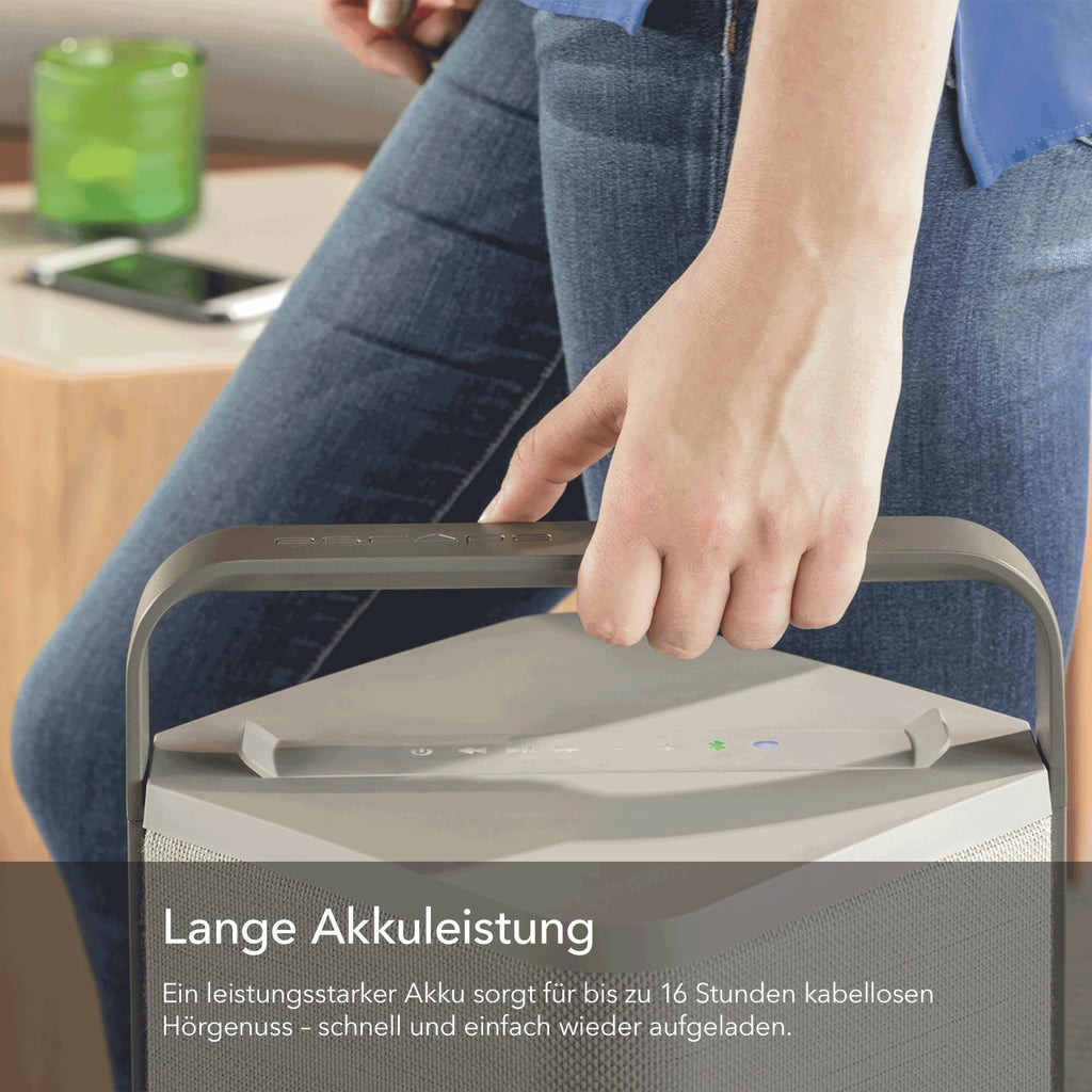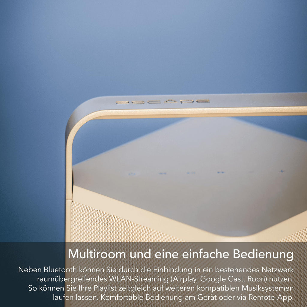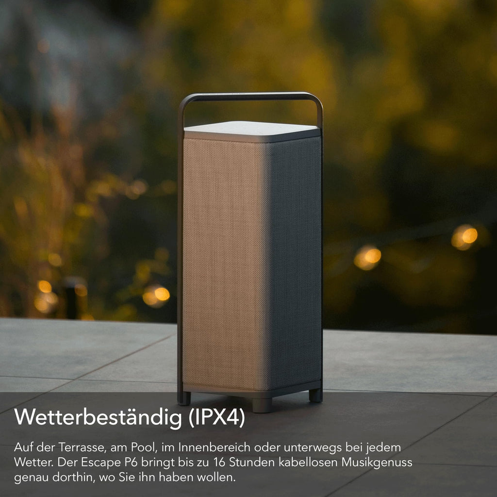 Escape P6AIRTAN Outdoor BT Speaker W Streaming Maximum Multi-Room Flexibility Audio Audiophile Portable Speaker Equipped with 6.5-inch Subwoofer - TanFeatures (1) || Audio Quality : Equipped with a 6.5-inch subwoofer & two custom-made 3-inch full-range drivers, delivering 360-degree sound with exceptional clarity | Power Output : 60W RMS, powered by a digital amplifier with 24-bit DSP technology | Wireless Connectivity : Supports AirPlay 2, Chromecast built-in, Spotify Connect & Bluetooth 5.0 for versatile streaming options | Multi-Room Audio : Compatible with multi-room setups, allowing seamless integration with other devices ||Features (2) || Weatherproof Design : IPX4-rated for water resistance, making it suitable for outdoor use | Battery Life : Offers up to 16 hours of playback at background volume or 8 hours at typical listening volume, thanks to its lithium iron phosphate (LiFePo4) battery | Three Radio Presets : Use the three presets from the P6 Air keyboard to save your favorite airable radio station. Dimensions : Approximately 21.6 (H) x 9.9 (W) x 10.3 (D) inch | Weight : Around 16.5 lbs (7.5 kg). ||The Escape P6 Air Tan is a high-performance portable wireless speaker designed for audiophiles who value both sound quality and stylish design. This speaker combines elegant aesthetics with powerful performance, making it ideal for both indoor and outdoor use. ||The Escape P6 Air is based on the P6 BT platform but thanks to AirPlay 2, Chromecast built-in and Roon it offers the possibility to wirelessly stream music via an existing WIFI network to multiple speakers without the limitations of a single brand. ||Like the P6 BT, this audiophile portable speaker is still most notable for its subtle beauty, discreetly adding style and color to your interior and far beyond.