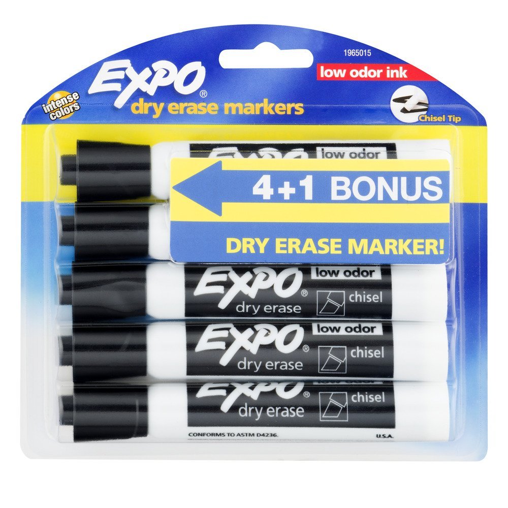 Expo Dry Erase Markers, Chisel Tip, Low Odor Ink, Black Ink, 4+1 Bonus Pack
