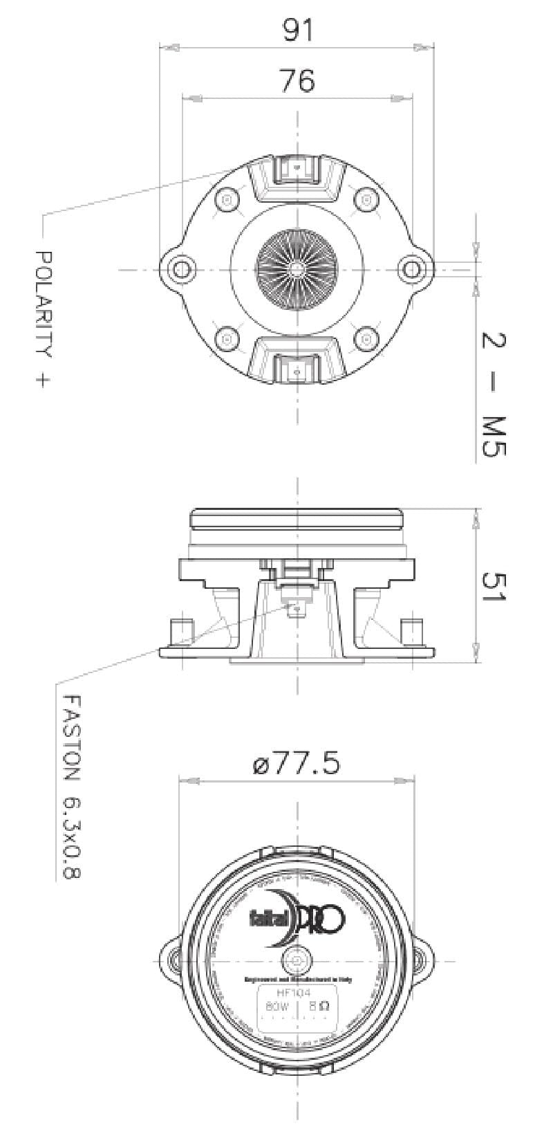 - TECHNICAL PARAMETERS || Nominal Impedance : 8 Ohm || Minimum Impedance : 6.9 Ohm || AES Power Handling (1) : 40 W || Maximum Power Handling (2) : 80 W || Minimum Crossover Frequency (3) : 1.7 kHz || Sensitivity (1W/1m) (4) : 108 dB || Frequency Range : 1.5÷20 kHz || Voice Coil Diameter : 37 mm (1.46 in) || Winding Material : Al || Former Material : Kapton ||