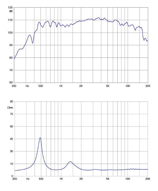 - "TECHNICAL PARAMETERS || Nominal Impedance : 8 Ohm || Minimum Impedance : 7.4 Ohm || AES Power above 0.9 kHz (1) : 80 W || AES Power above 0.65 kHz : 40 W || Maximum Power above 0.9 kHz (2) : 160 W || Maximum Power above 0.65 kHz : 80 W || Minimum Crossover Frequency (3) : 0.9 kHz || Sensitivity (1W/1m) (4) : 109 dB || Frequency Range : 0.5÷18 kHz || Voice Coil Diameter : 65 mm (2.56 in) || Winding Material : Al || Former Material : Kapton || "