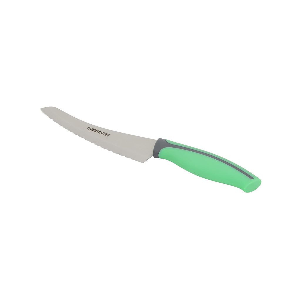 Farberware Soft Grip Serrated Utility Knife, 5.5-Inch, GreenULTRA-SHARP PRECISION: The precision-edge blades are made ultra-sharp through a specialized machine grinding process, featuring a unique scalloped design for superior slicing.IDEAL FOR PRECISION CUTTING: This knife is designed with sharp serrations that easily cut through a variety of hard and soft breads.ERGONOMIC SOFT-GRIP HANDLE: The handle is specially designed with an ergonomic, contoured shape to optimize control and comfort for everyday use.INCLUDES: 8-inch bread knife, an essential tool for any kitchen.EASY CARE: Hand wash with warm water and mild detergent; rinse and dry immediately. Stainless steel knives are not dishwasher safe.