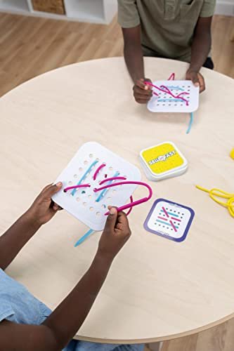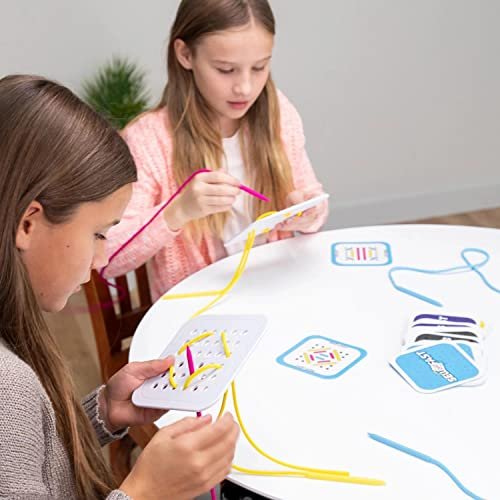 - PACKAGE INCLUDES: 1 Sew Fast thread race game set - 2 yellow strings, 2 pink strings, 2 blue strings, 2 threading boards, and 40 challenge cards