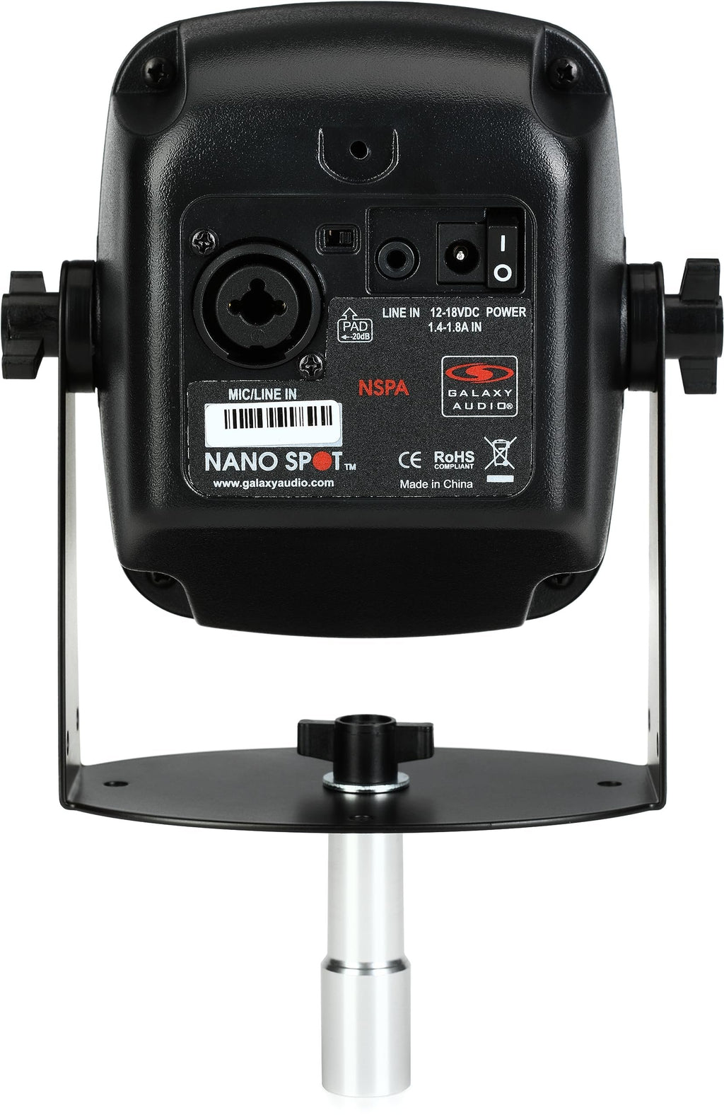 Galaxy Audio NSPA Nano Spot Personal Monitor Speaker, Black25 Watts3" Ceramic driverFreq. Response 150Hz - 17kHz24VDC phantom power; 18VDC power supplyStand/wall mount included