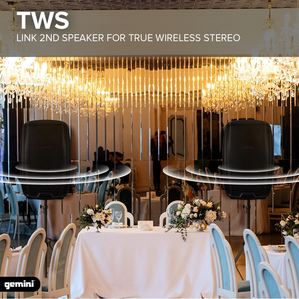 - ENDLESS AUDIO OPTIONS The Gemini speaker and Portable Bluetooth PA system features 2 input channels with separate gain controls. Switchable Line/Mic XLR and 1/4” inputs plus RCA and 1/8” AUX input. Master high/low equalization controls allow you to dial the perfect sound. XLR mix output allows for connecting to additional speakers.