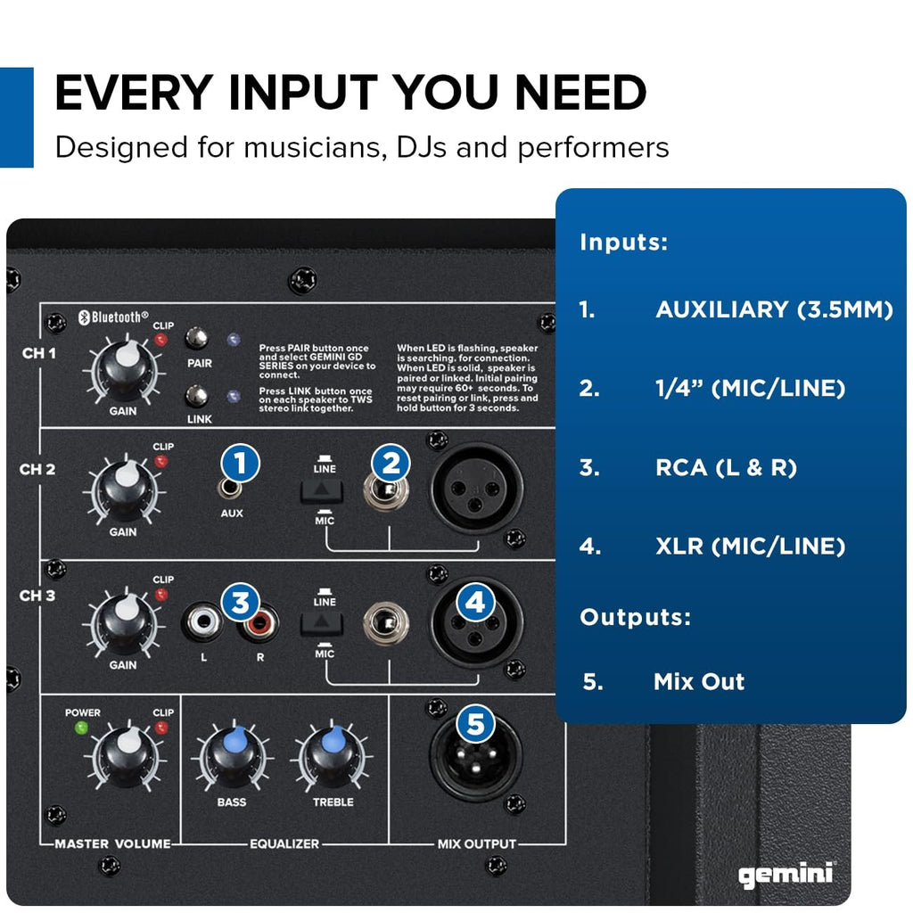 Unleash unparalleled audio performance with the Gemini Sound GD-215PRO and GD-L215PRO, the ultimate professional PA speakers designed to elevate your events, parties, and performances. These powerful, Bluetooth-enabled speakers boast an impressive 1300-watt peak power output, driven by enhanced Class-D amplifiers that deliver deep, resonant bass through 15-inch subwoofers and crisp highs from 1.35-inch titanium tweeters. Whether you're a DJ, an event organizer, or a music enthusiast, these speakers are perfect for any occasion, from intimate gatherings to large-scale events. The GD-215PRO is engineered for durability and adaptability, featuring ergonomic handles for easy transport and versatile mounting options to ensure optimal sound dispersion in any setting. This speaker's 3-channel mixer provides precise control over your audio with dedicated gain knobs, clip lights, and switchable Mic/Line inputs. Experience the convenience of wireless music streaming with Bluetooth connectivity and True Wireless Stereo (TWS) linking, allowing you to pair with another GD Series speaker for an expansive, cable-free sound system. Step up your game with the GD-L215PRO, which not only offers the same high-quality audio features as the GD-215PRO but also includes dynamic LED Party Lighting FX. These vibrant lights transform any venue into a captivating dance floor, making it the perfect choice for parties and events where visual appeal is just as important as sound quality. With six lighting modes that react to your music, the GD-L215PRO ensures an unforgettable experience for your audience. Both models are built to withstand the rigors of frequent use and transport, featuring a robust, impact-resistant cabinet. They offer multiple inputs, including XLR, RCA, and 1/8" for diverse connectivity options, and an onboard equalizer for complete sound control. Whether you're setting up a sound system for a church, a studio, or an outdoor PA system, these speakers provide the flexibility and power you need. Designed for the discerning audio professional and the passionate enthusiast alike, these speakers cater to a wide range of applications. From DJ equipment and studio speakers for music production to portable PA systems for bands and big party speakers, the GD-215PRO and GD-L215PRO deliver exceptional performance. The integrated Bluetooth technology with TWS linking allows for seamless wireless audio playback, making them ideal for any wireless speaker system setup. For DJs and performers, the GD-215PRO and GD-L215PRO offer a professional-grade sound system that can handle the demands of live performances and DJ sets. The powerful 15-inch subwoofers and precise high-frequency drivers ensure your music sounds clear and impactful, whether you're using them as part of a larger DJ system or as standalone loudspeakers. Optimize your sound setup with these versatile PA speakers, which are perfect for everything from intimate indoor venues to large outdoor events. The GD-215PRO and GD-L215PRO are your go-to solutions for reliable, high-quality audio performance, providing the ultimate in power, clarity, and convenience. Elevate your audio experience with Gemini Sound β where unmatched audio meets professional-grade performance and captivating lighting effects.