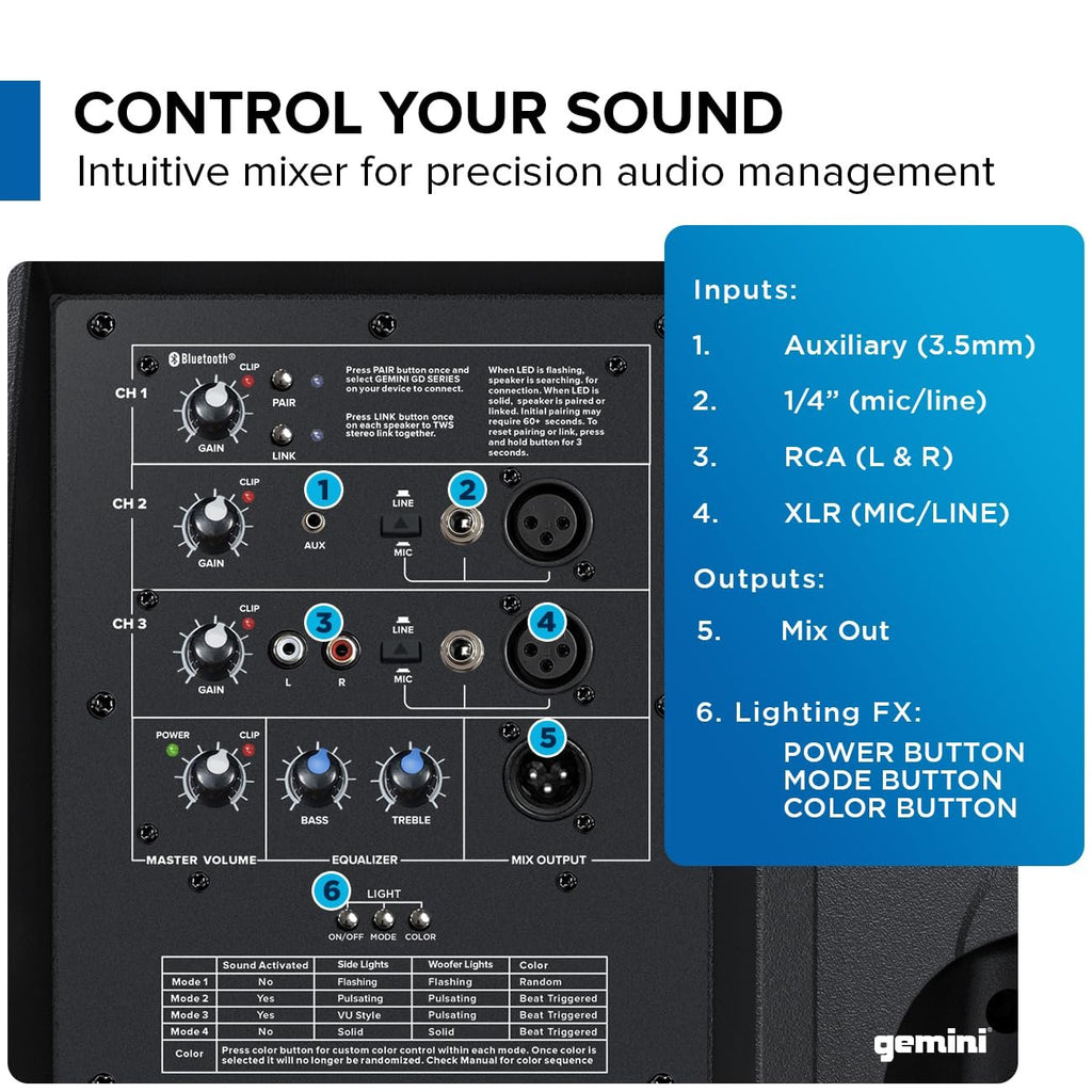 Unleash unparalleled audio performance with the Gemini Sound GD-215PRO and GD-L215PRO, the ultimate professional PA speakers designed to elevate your events, parties, and performances. These powerful, Bluetooth-enabled speakers boast an impressive 1300-watt peak power output, driven by enhanced Class-D amplifiers that deliver deep, resonant bass through 15-inch subwoofers and crisp highs from 1.35-inch titanium tweeters. Whether you're a DJ, an event organizer, or a music enthusiast, these speakers are perfect for any occasion, from intimate gatherings to large-scale events. The GD-215PRO is engineered for durability and adaptability, featuring ergonomic handles for easy transport and versatile mounting options to ensure optimal sound dispersion in any setting. This speaker's 3-channel mixer provides precise control over your audio with dedicated gain knobs, clip lights, and switchable Mic/Line inputs. Experience the convenience of wireless music streaming with Bluetooth connectivity and True Wireless Stereo (TWS) linking, allowing you to pair with another GD Series speaker for an expansive, cable-free sound system. Step up your game with the GD-L215PRO, which not only offers the same high-quality audio features as the GD-215PRO but also includes dynamic LED Party Lighting FX. These vibrant lights transform any venue into a captivating dance floor, making it the perfect choice for parties and events where visual appeal is just as important as sound quality. With six lighting modes that react to your music, the GD-L215PRO ensures an unforgettable experience for your audience. Both models are built to withstand the rigors of frequent use and transport, featuring a robust, impact-resistant cabinet. They offer multiple inputs, including XLR, RCA, and 1/8" for diverse connectivity options, and an onboard equalizer for complete sound control. Whether you're setting up a sound system for a church, a studio, or an outdoor PA system, these speakers provide the flexibility and power you need. Designed for the discerning audio professional and the passionate enthusiast alike, these speakers cater to a wide range of applications. From DJ equipment and studio speakers for music production to portable PA systems for bands and big party speakers, the GD-215PRO and GD-L215PRO deliver exceptional performance. The integrated Bluetooth technology with TWS linking allows for seamless wireless audio playback, making them ideal for any wireless speaker system setup. For DJs and performers, the GD-215PRO and GD-L215PRO offer a professional-grade sound system that can handle the demands of live performances and DJ sets. The powerful 15-inch subwoofers and precise high-frequency drivers ensure your music sounds clear and impactful, whether you're using them as part of a larger DJ system or as standalone loudspeakers. Optimize your sound setup with these versatile PA speakers, which are perfect for everything from intimate indoor venues to large outdoor events. The GD-215PRO and GD-L215PRO are your go-to solutions for reliable, high-quality audio performance, providing the ultimate in power, clarity, and convenience. Elevate your audio experience with Gemini Sound β where unmatched audio meets professional-grade performance and captivating lighting effects.