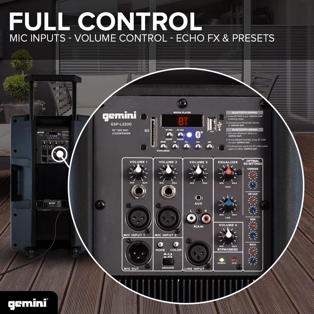 Gemini Sound GSP-L2200PK Indoor 2200 Watt Peak Bi-Amped Wired AC Powered Bluetooth DJ Speaker with 15" Inch Woofer, LED Party Lights, Built in Media Player, and Included Microphone and Speaker Stand