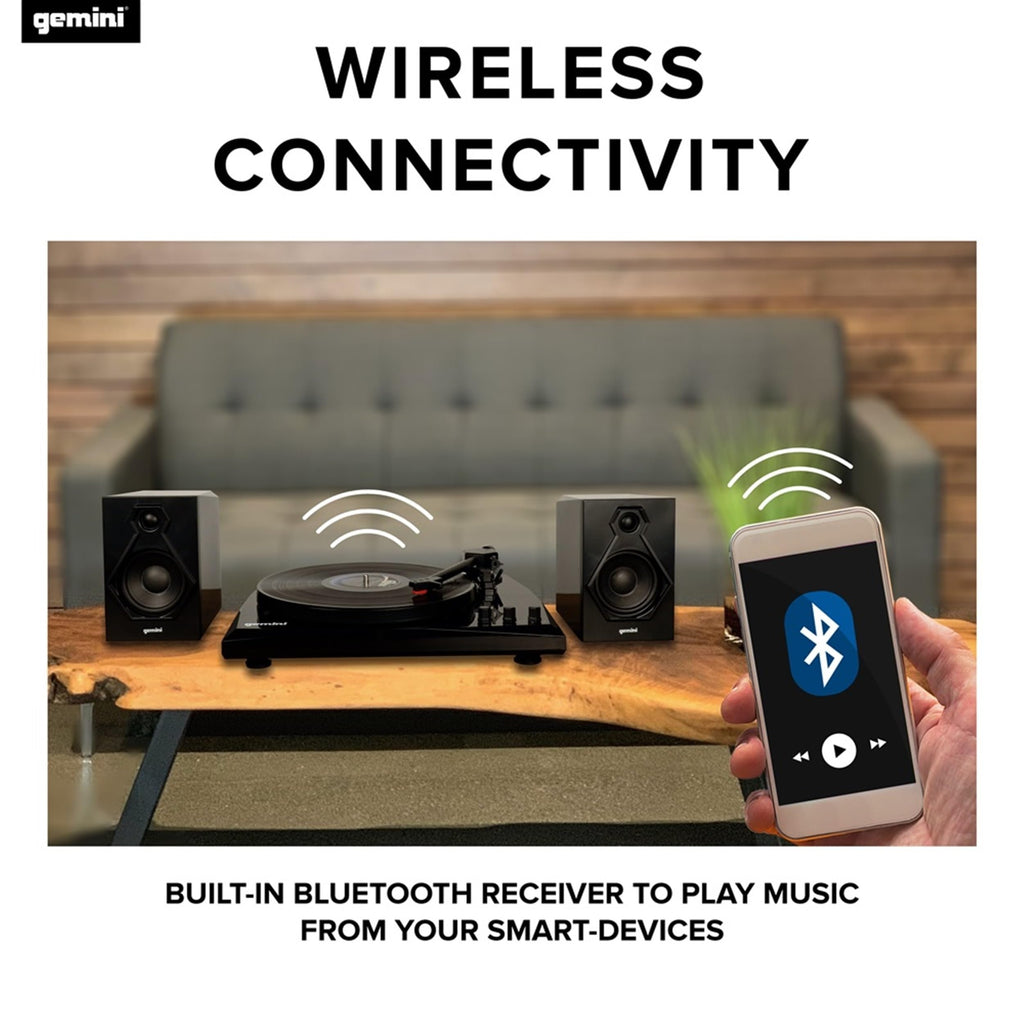 Gemini Sound TT-900 - Classic Black 3-Speed Turntable with Pitch Adjustment, Bluetooth Connectivity, and High-Fidelity Stereo SoundIMMERSIVE VINYL EXPERIENCE: Immerse yourself in the rich, warm sound of vinyl records with the Gemini Sound Turntable. Experience 3 speeds for 33 1/3, 45, and 78 RPM, allowing you to play all your favorite records. The included pitch adjustment feature lets you fine-tune the playback speed for optimal listening pleasure.WIRELESS SPEAKER SYSTEM: Enjoy a complete audio experience with the built-in 2 x 50W 2-way stereo speakers. Connect your Bluetooth-enabled device to the speakers and stream your favorite music wirelessly. Experience the convenience of wireless audio playback without the need for external speakers.PREMIUM SOUND QUALITY: The Gemini Sound Turntable features a ceramic stereo cartridge with a stylus, ensuring superior audio reproduction. Hear every detail and nuance of your vinyl collection with clarity and precision. Experience the warmth and authenticity of analog music.EASY SETUP AND VERSATILE OPTIONS: Setting up the Gemini Sound Turntable is a breeze. It comes with a felt slipmat, AC adapter, RCA cable, and a user manual to guide you through the setup process. With the AUTO-STOP ON/OFF switch, you can choose whether the turntable automatically stops at the end of a record or continues to play.ENJOY YOUR VINYL AND MORE: Rediscover the joy of vinyl records and enhance your music listening experience. The Gemini Sound Turntable allows you to enjoy your vinyl collection with exceptional sound quality. Connect your Bluetooth-enabled device to the wireless speakers for added versatility and stream your favorite music with ease.ELEGANT COLOR OPTIONS: The Gemini Sound Turntable is available in a range of elegant colors, allowing you to choose the perfect match for your style and preference. Whether you prefer classic black, sophisticated white, or timeless walnut, this turntable adds a touch of refinement to your space. Elevate your listening experience with a visually stunning turntable that complements your personal aesthetic.