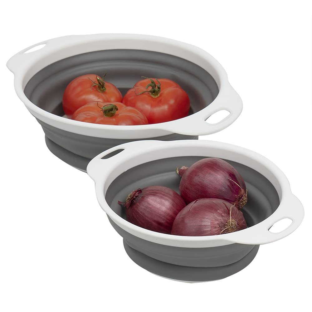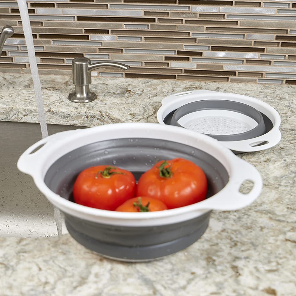 - Nesting Collapsible Colander drains and strains fruit, veggies, and pasta and more