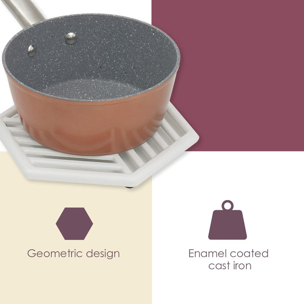 - GEOMETRIC DESIGN: This cast iron trivet has a hexagonal shape with lines throughout to give off a modern and geometric look.