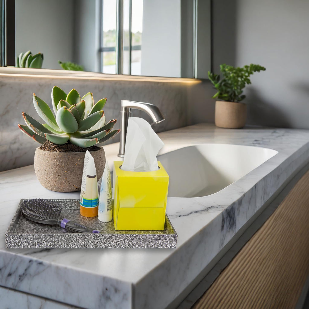 - STURDY AND DURABLE: Made from sturdy plastic, this decorative bathroom tray features tall side walls to prevent items from falling off while carrying.