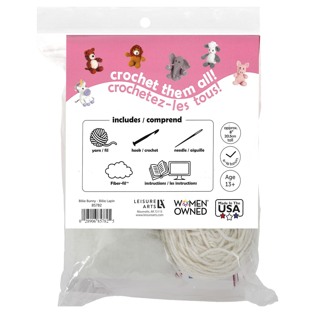 Evoke smiles and warmth with the Leisure Arts Crochet Friend Kit Amigurumi Bunny. This charming crochet animal kit for beginners brings to life a delightful bunny, adding a touch of handmade cuteness to your world. Inside the learn to crochet kit, you'll find all the essentials required to embark on this creative journey. The package includes carefully selected yarn, a user-friendly plastic crochet hook, a plastic needle for seamless finishing touches, and soft fiberfill to give the bear his adorable shape. Guiding you through each stitch is a set of step-by-step instructions that make crocheting the bunny a breeze, even if you're new to the craft. Designed with an easy skill level in mind, this crochet starter kit offers a satisfying experience for both beginners and experienced crocheters. Unleash your creativity as you bring the bunny to life, and don't hesitate to add your personal touch by selecting colors that resonate with you. Please note that colors and contents may vary slightly, ensuring your project remains wonderfully unique. Whether you're seeking a delightful crafting experience or a handmade companion to brighten your space, the Leisure Arts Crochet Friend Kit Bunny is your ticket to creating an enchanting and huggable masterpiece. Proudly made in the USA.Adorable Amigurumi Bunny: Create your own lovable, huggable 3" bunny named Billie with this crochet kit for beginners kids, adding charm and fun to your needlework collection. Proudly made in the USAComplete Kit: Everything you need is included - yarn, a plastic crochet hook, a plastic needle, fiberfill, and step-by-step instructions, ensuring a seamless crafting experience.Beginner-Friendly: Designed with an easy skill level in mind, this crochet for beginners is perfect for both beginners and experienced crocheters looking for a fun and rewarding project.Personalized Creations: Express your creativity by using your own yarn to customize the bunny's colors and details as you crochet, making each amigurumi crochet kit truly one-of-a-kind.Crafting Delight: Whether you're new to amigurumi or a crochet enthusiast, this beginner crochet kit for kids and adults promises hours of joy and relaxation, resulting in an adorable bear companion to cherish.