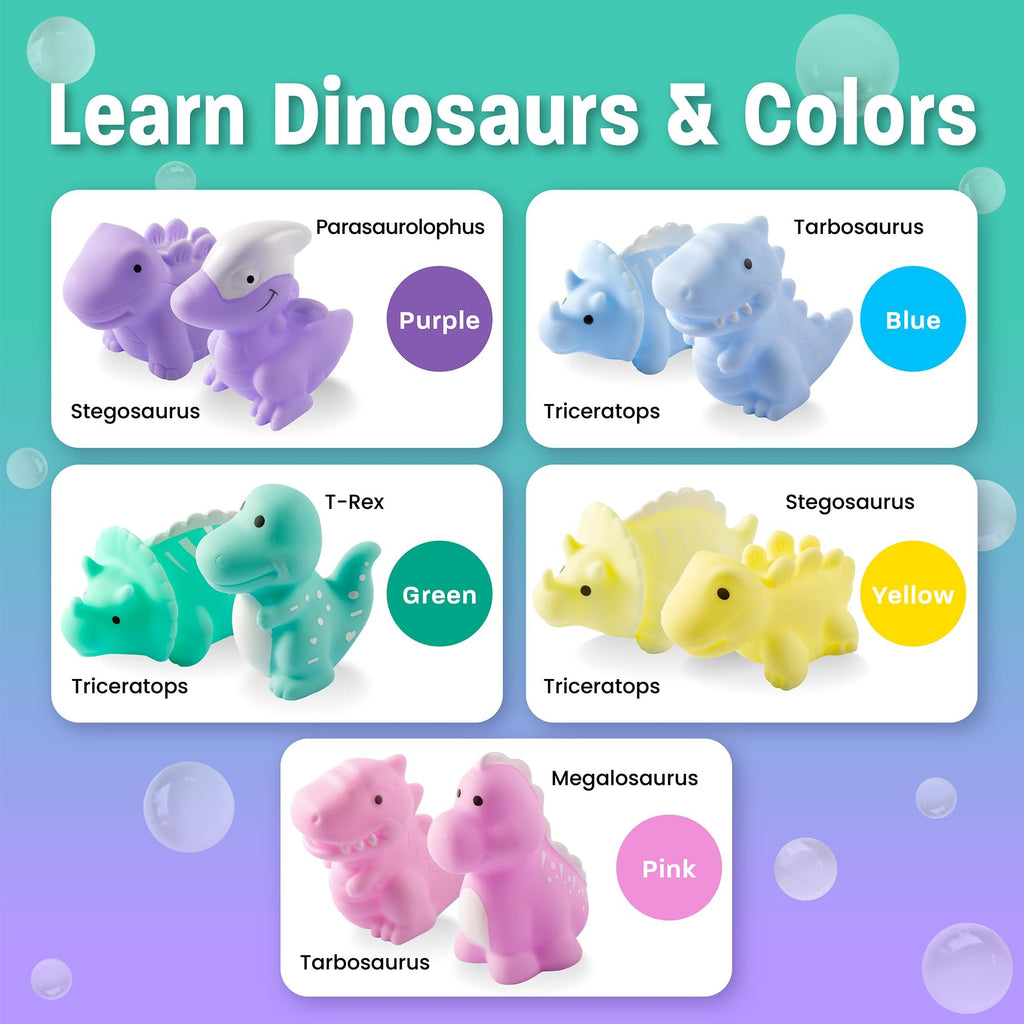 Does bath time feel like a never-ending challenge with your child? Do you need help keeping them interested and excited about getting clean? We get it—bath time can sometimes be tedious for parents and kids. Regular kids bath toys might not spark your child's imagination, leading to resistance and boredom. Plus, worries about toys getting dirty can make bath time a bit stressful. That's where our Bath Tub Toys come in! We've reinvented bath time to be an exciting adventure for your little one. These vibrant dinosaur toys for girls aren't just safe; they also have a clever no-hole design, so bath time stays clean and worry-free. But wait, there's more! Our Baby Bathtub Toys do more than keep things tidy; they also ignite your child's creativity and help them learn. Watch as your child's imagination takes off, creating thrilling prehistoric stories and adventures in the tub. These silicone bath toys aren't just for fun; they also help your child develop fine motor skills and hand-eye coordination, making bath time a valuable experience. With our Bathroom Toys, you can say goodbye to bath time battles and hello to precious moments of laughter and learning. Turn bath time into a highlight of the day with these colorful dinosaur companions. Your child's excitement and engagement will turn bath time into a cherished routine for both of you. Experience the joy of seeing your child eagerly look forward to bath time. Our Dino Bath Toys transform this daily ritual into a delightful adventure filled with laughter and learning. Say goodbye to the struggles and stress, and welcome bath time for bonding and fun with your little one.Dino Bath Toys - Enjoy carefree bath time and watch your little one's imagination soar with these colorful dinosaur toys. Create exciting prehistoric adventures while ensuring a safe and enjoyable bath time experienceBoost Motor Skills - Squishy and easy to grasp, these water toys are suitable for tiny hands. Watch those little fingers grab, squeeze, and dunk, as they develop fine motor skills and hand-eye coordinationNo Hole Bath Toys - Our clever no-hole design keeps these bath time toys dry and clean, ready for fun in the tub, pool, or beach every time without the icky surprisesAssemble Your Dino Squad - Get a full crew of 12 dinos in every pack! Mix and match these toddler bath toys, choose from 5 different dinosaurs to create the ultimate bath-time squad!Pretty Pastel Colors - Designed in calm pastel shades, these bath toys for kids demand attention. The pink, purple, blue, green, and yellow colors are a delight to play with