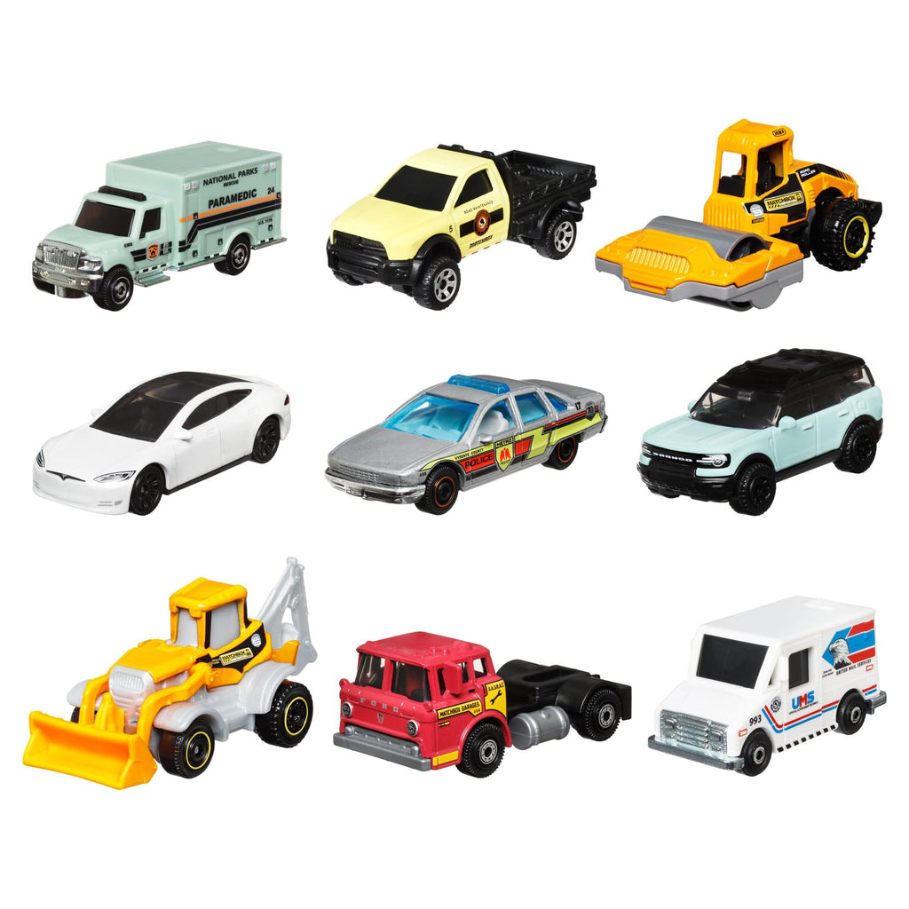 Matchbox Cars, 9-Pack Die-Cast 1:64 Scale Toy Cars, Construction or Garbage Trucks, Rescue Vehicles or Planes (Styles May Vary).